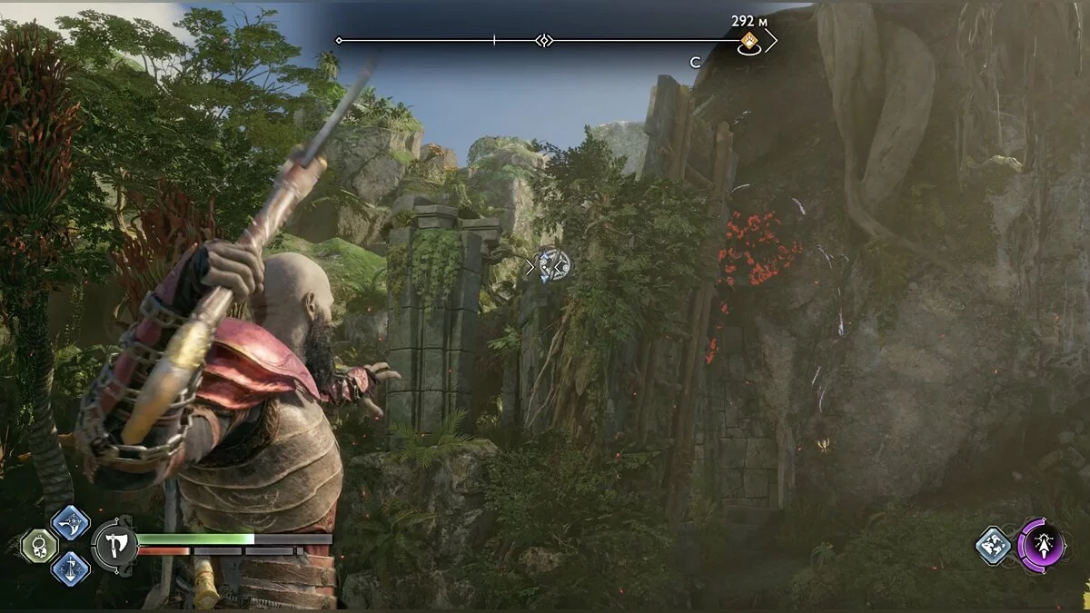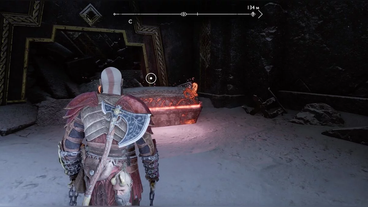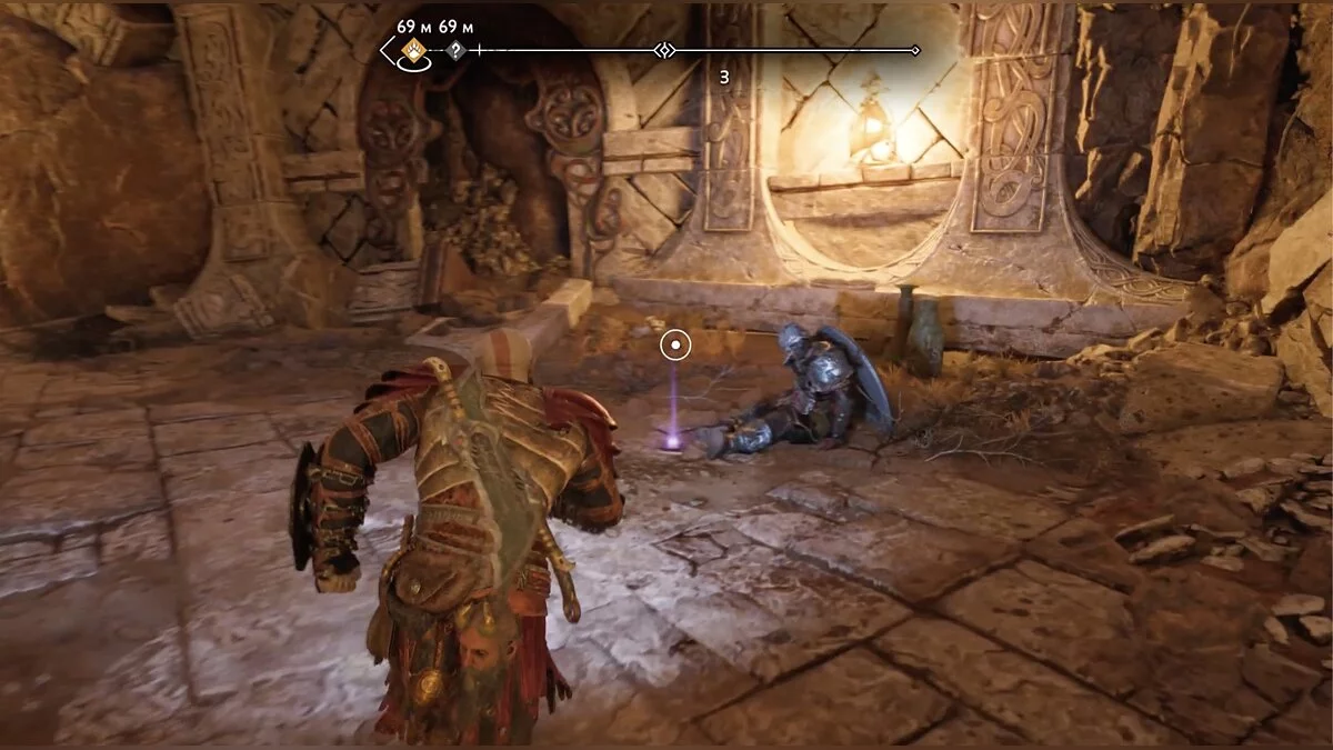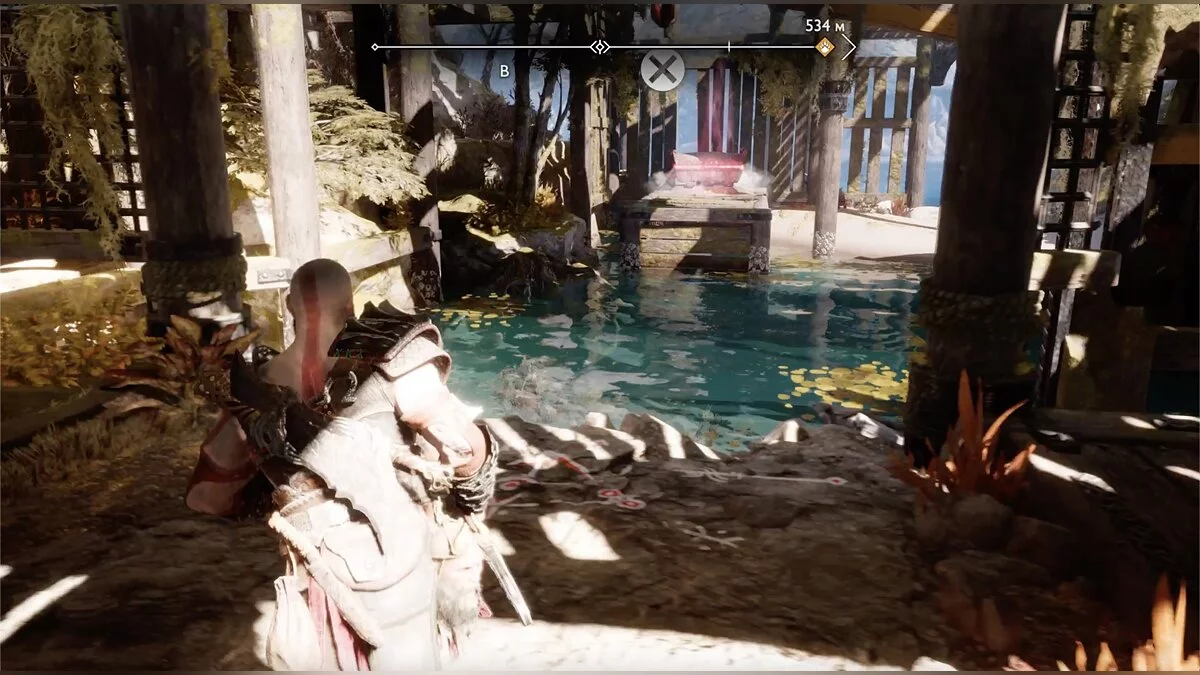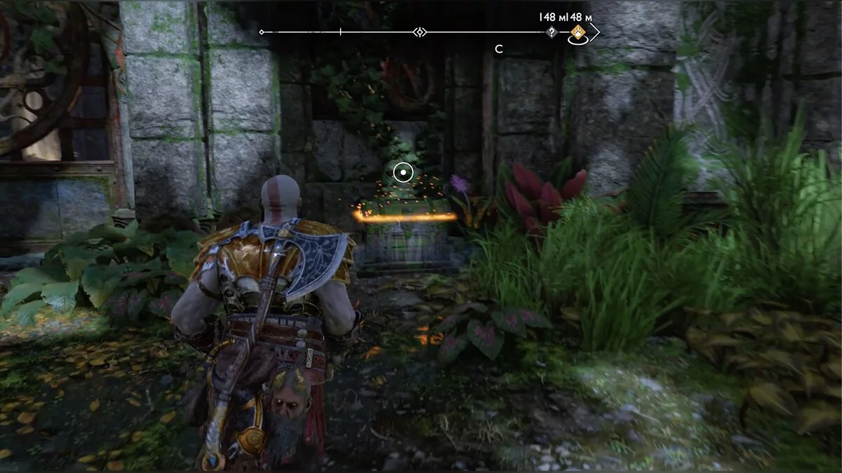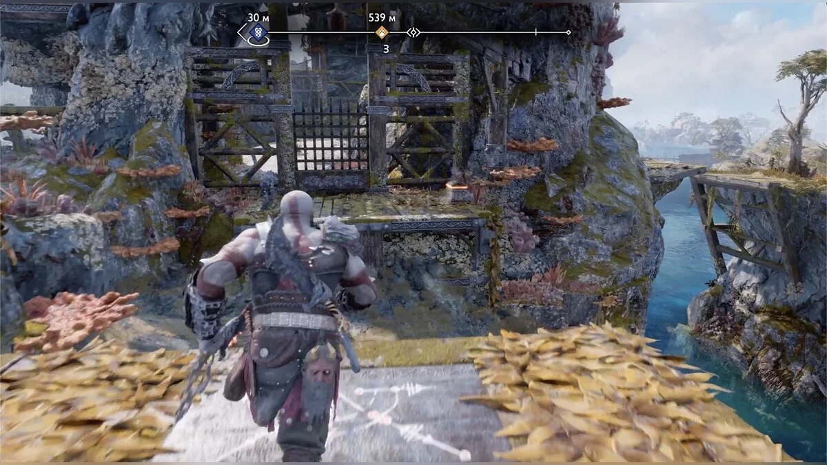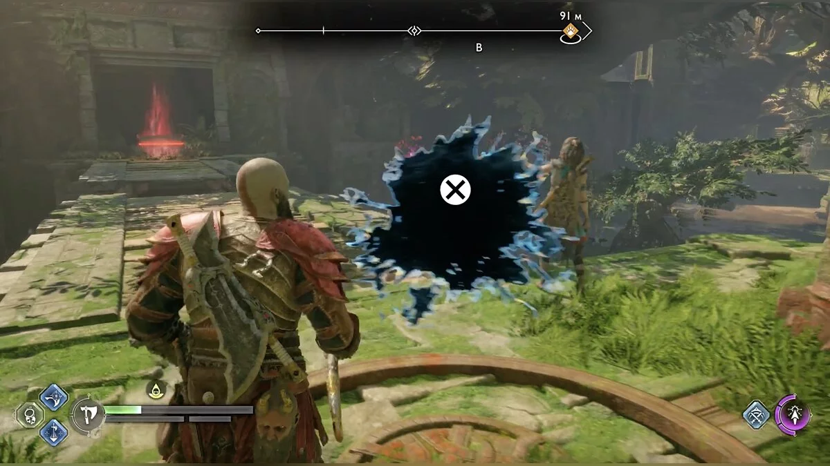 Путешествуя под землей, вы наткнетесь на укрепление для клинков Хаоса, которое обросло наростами. Разбейте их стрелами Атрея, чтобы получить доступ и перепрыгнуть на другую сторону. Основной путь ведет вас вперед, однако обратите внимание на левую сторону коридора. Первый поворот позволит открыть быстрый переход в место, где вы уже были — он нам не нужен. Во втором повороте можно перепрыгнуть небольшой водопад и спуститься вниз. Там Кратос найдет артефакт, а также ворота, которые можно открыть.