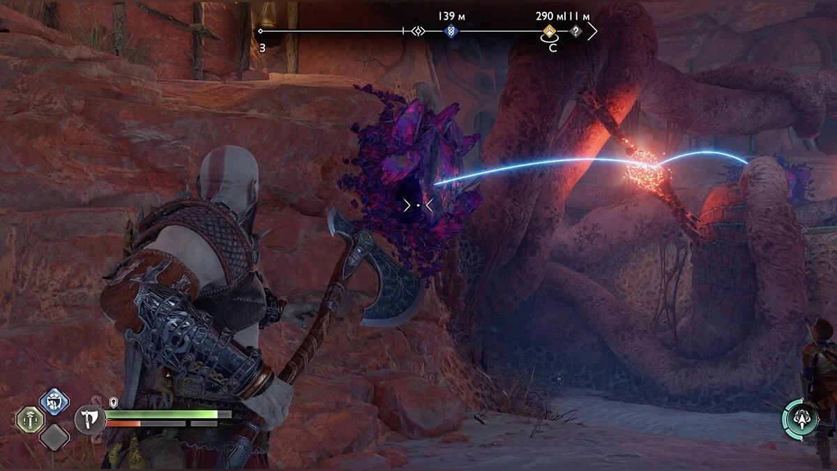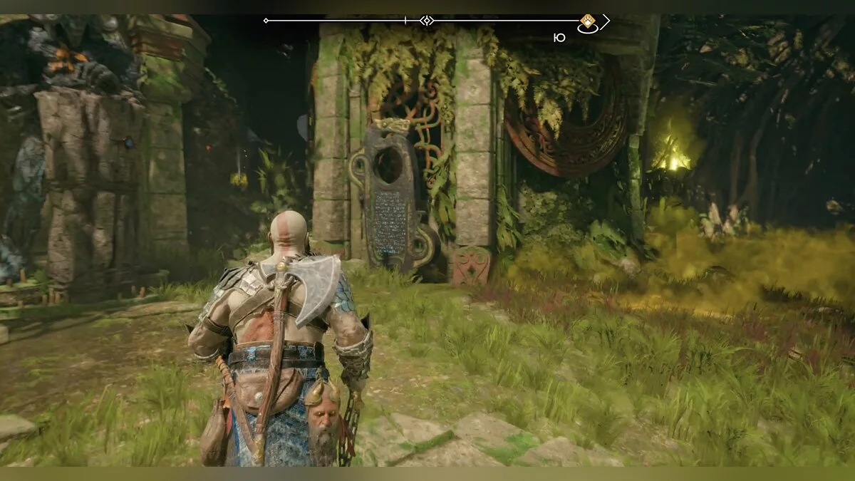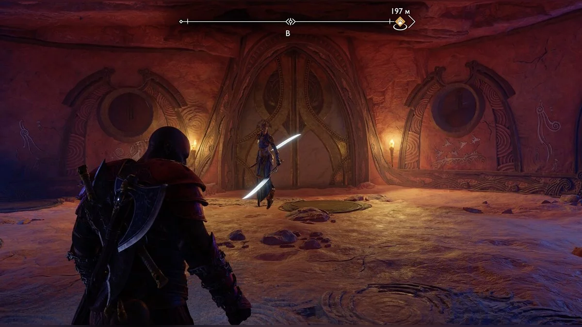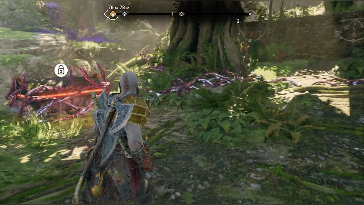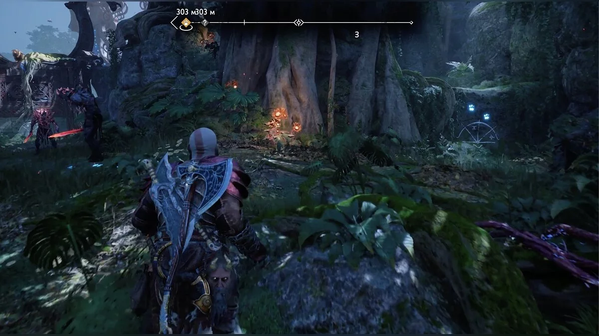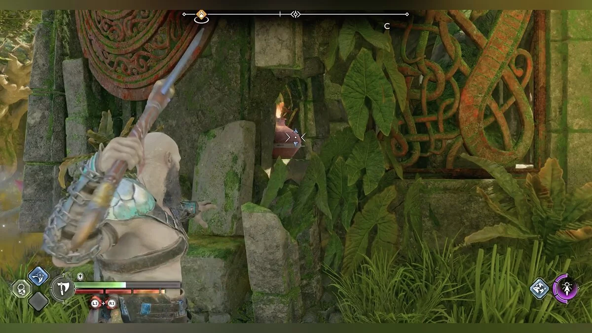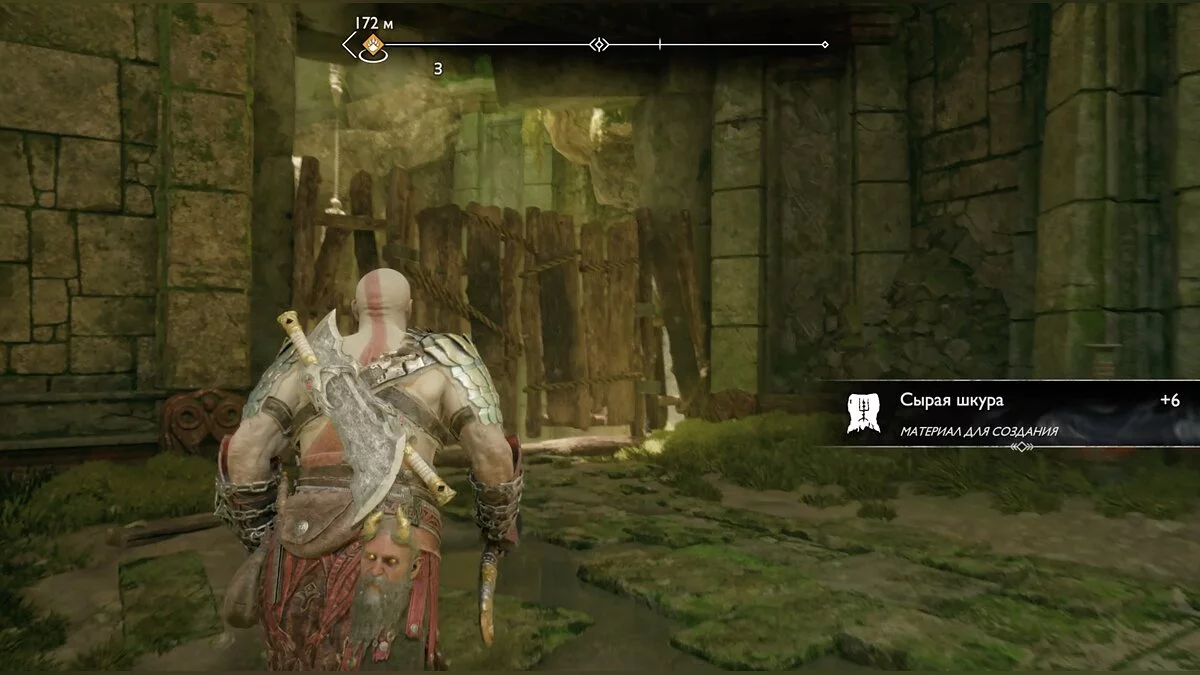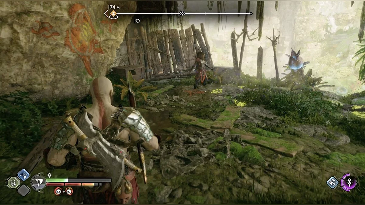 Путешествуя под землей, вы наткнетесь на укрепление для клинков Хаоса, которое обросло наростами. Разбейте их стрелами Атрея, чтобы получить доступ и перепрыгнуть на другую сторону. Основной путь ведет вас вперед, однако обратите внимание на левую сторону коридора. Первый поворот позволит открыть быстрый переход в место, где вы уже были — он нам не нужен. Во втором повороте можно перепрыгнуть небольшой водопад и спуститься вниз. Там Кратос найдет артефакт, а также ворота, которые можно открыть.
