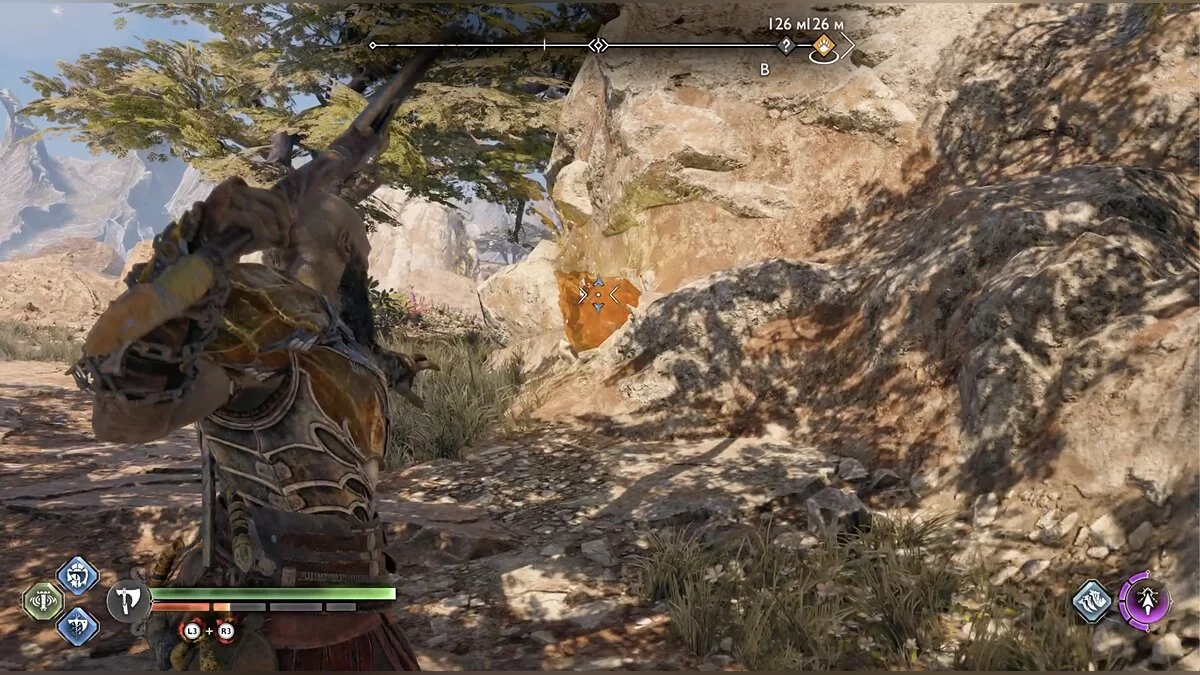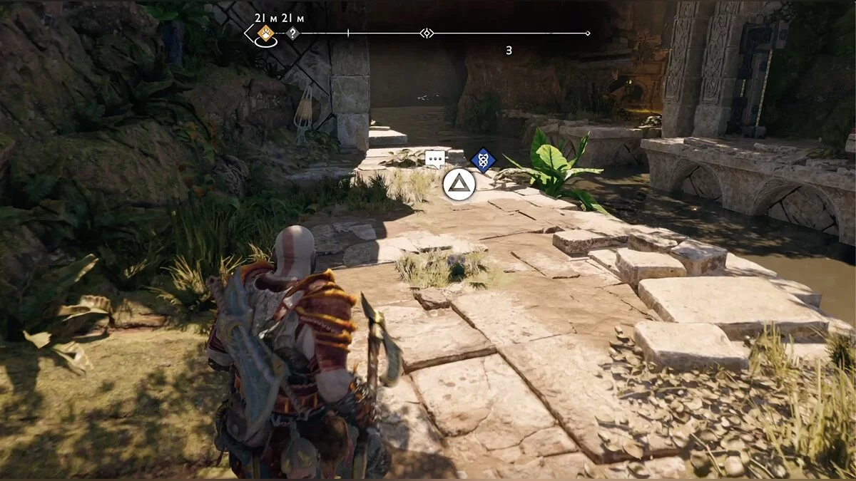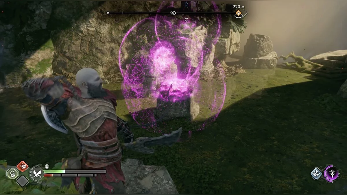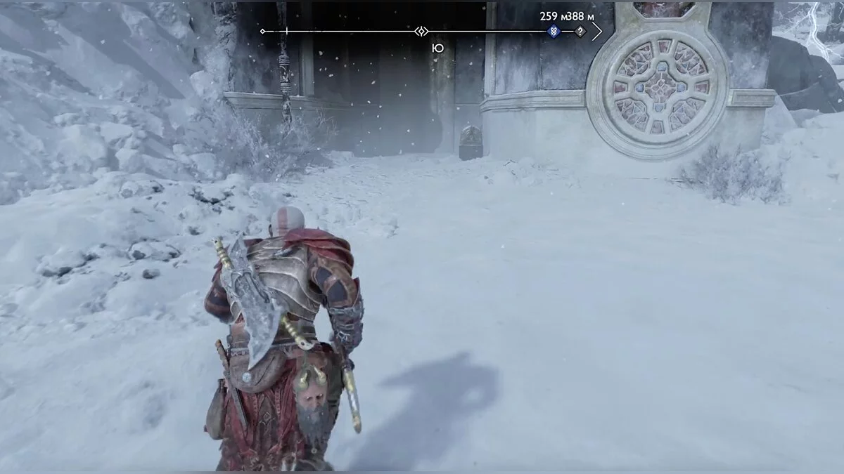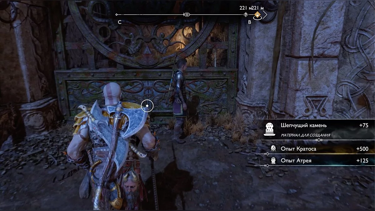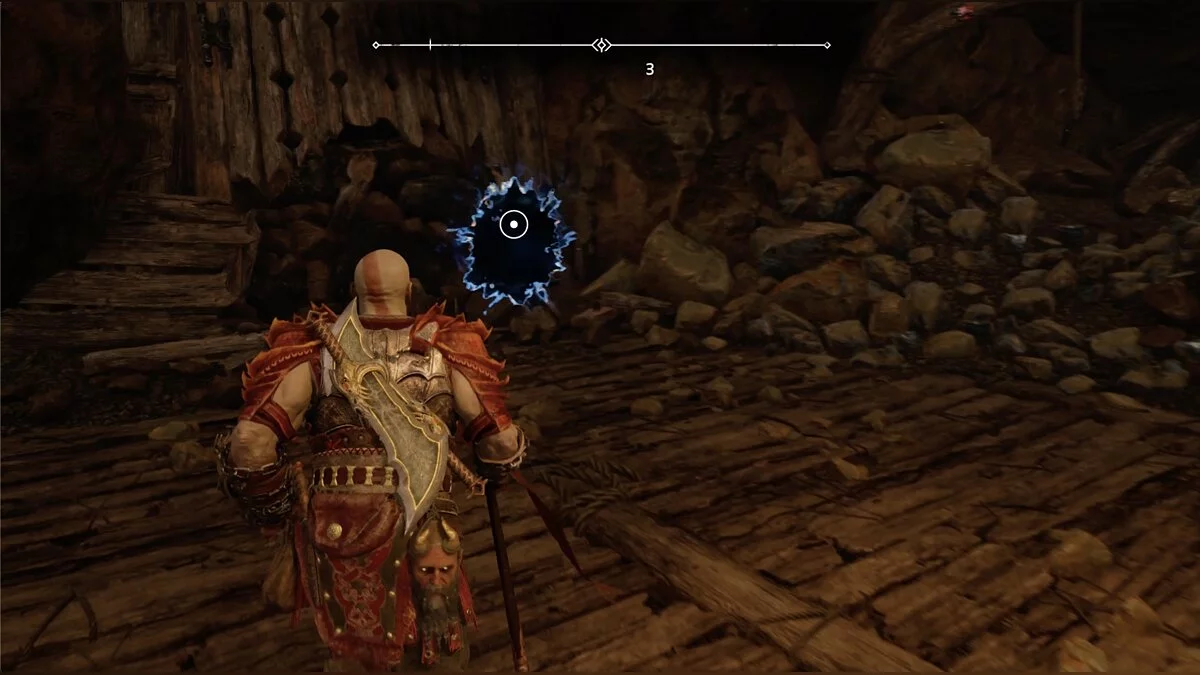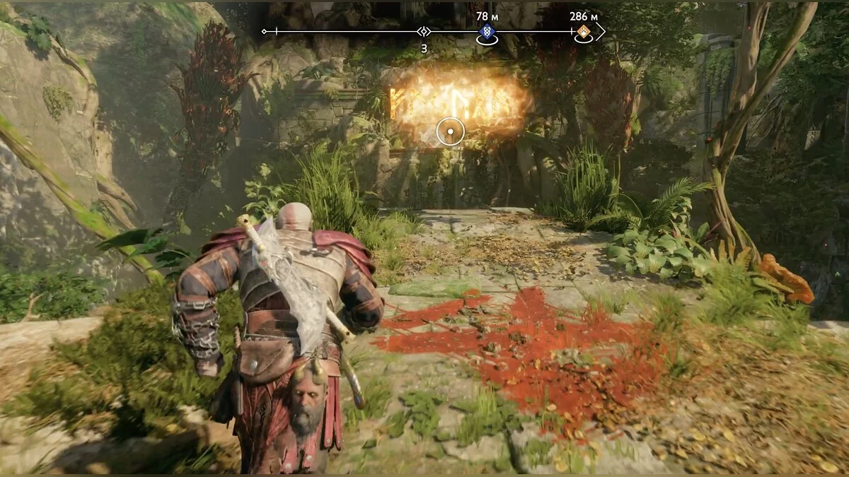 Путешествуя под землей, вы наткнетесь на укрепление для клинков Хаоса, которое обросло наростами. Разбейте их стрелами Атрея, чтобы получить доступ и перепрыгнуть на другую сторону. Основной путь ведет вас вперед, однако обратите внимание на левую сторону коридора. Первый поворот позволит открыть быстрый переход в место, где вы уже были — он нам не нужен. Во втором повороте можно перепрыгнуть небольшой водопад и спуститься вниз. Там Кратос найдет артефакт, а также ворота, которые можно открыть.