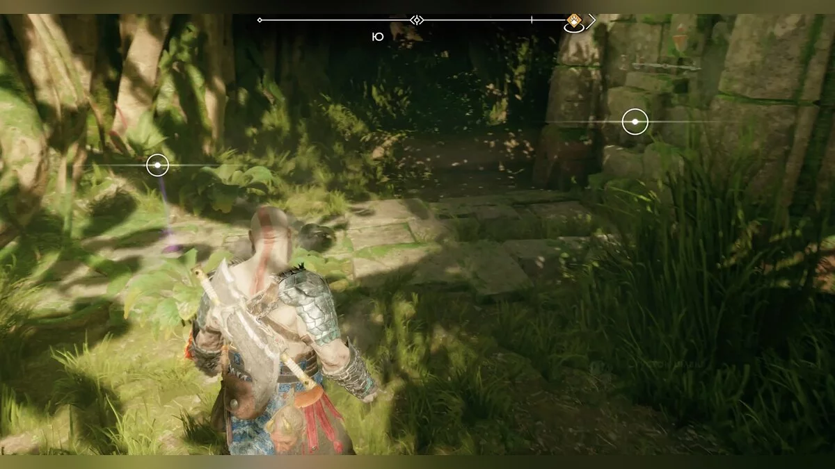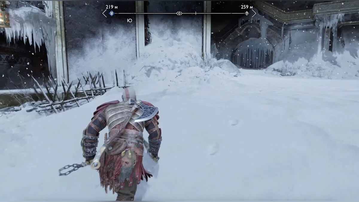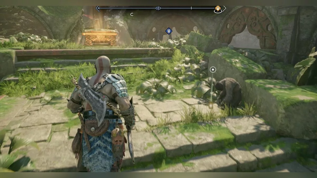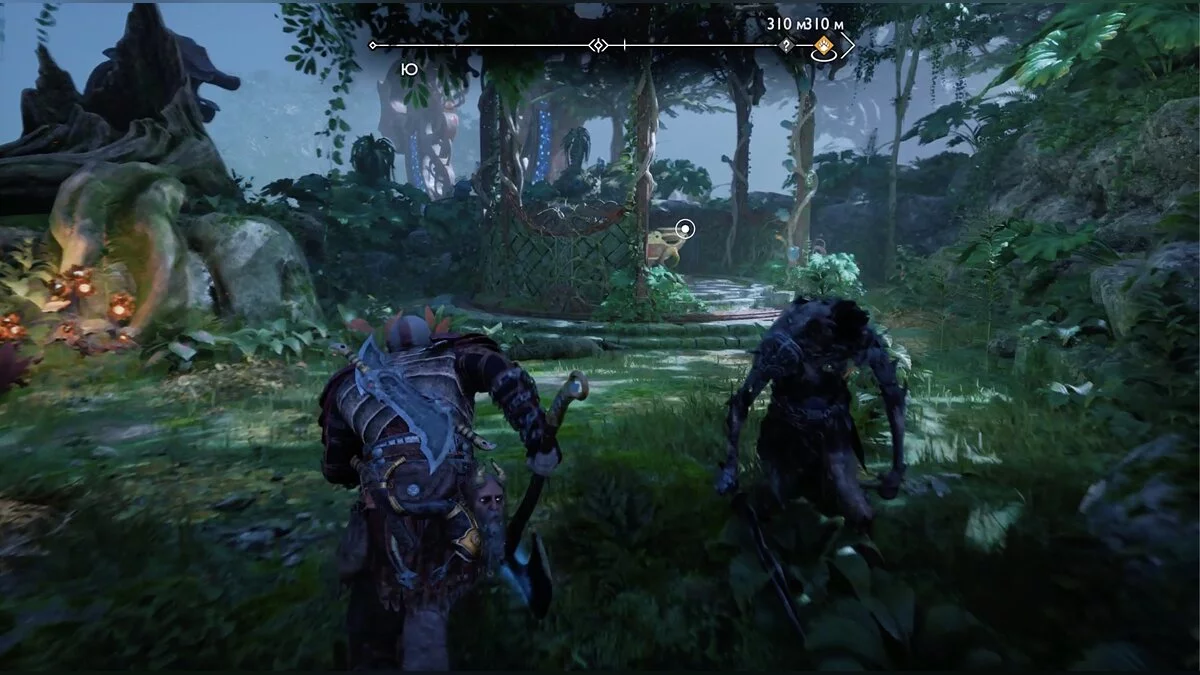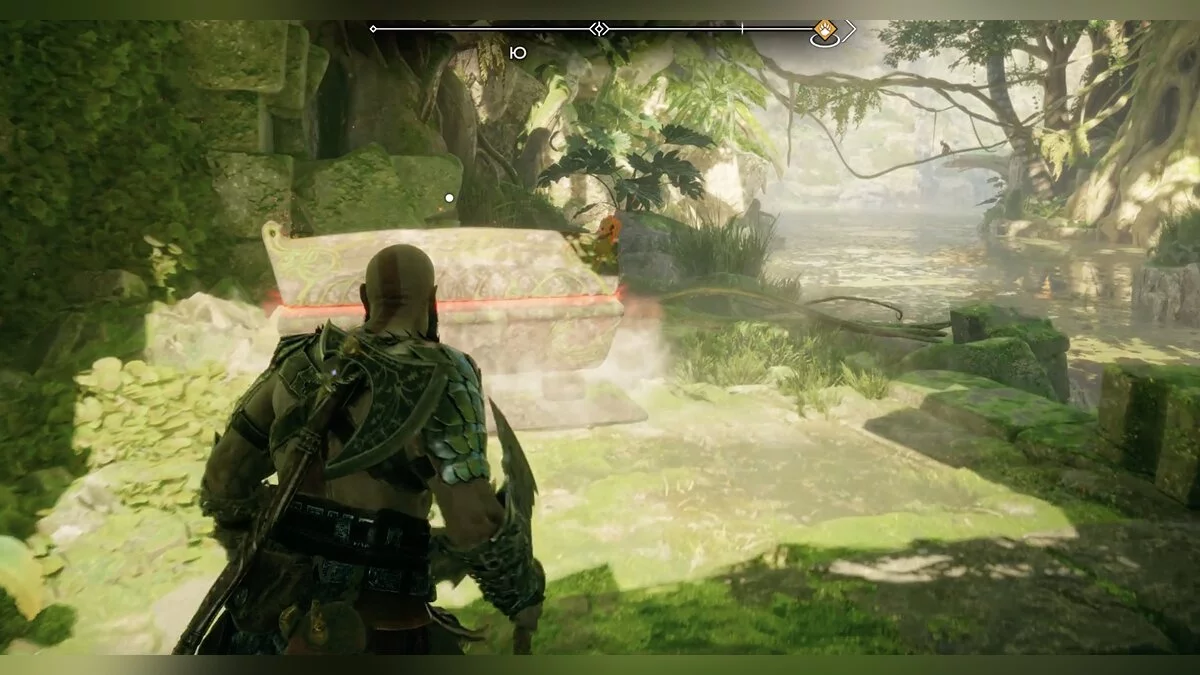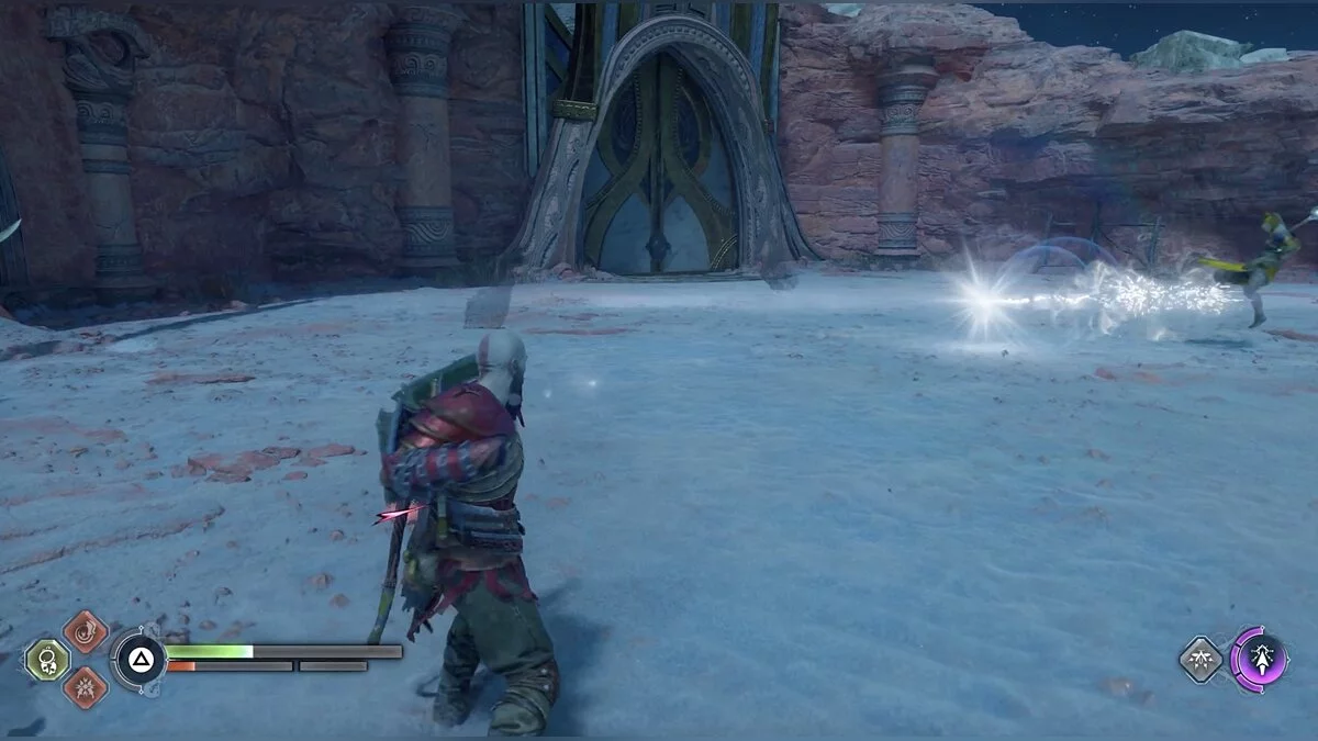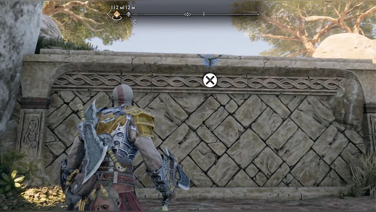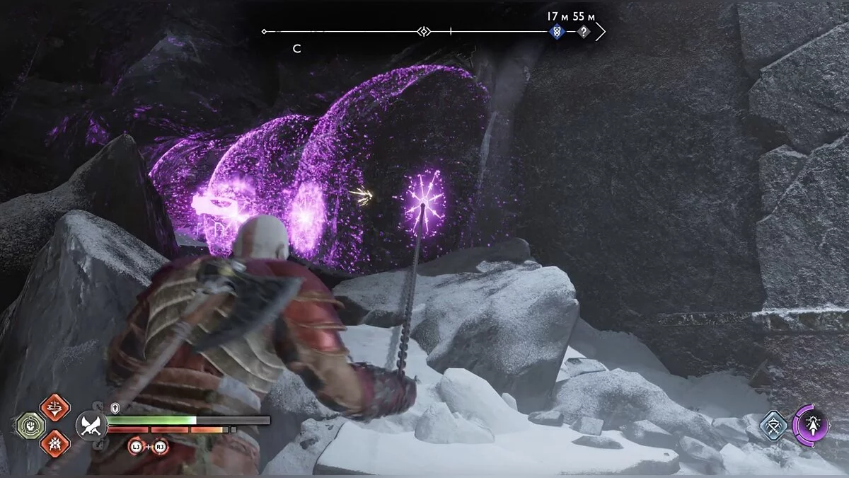 Путешествуя под землей, вы наткнетесь на укрепление для клинков Хаоса, которое обросло наростами. Разбейте их стрелами Атрея, чтобы получить доступ и перепрыгнуть на другую сторону. Основной путь ведет вас вперед, однако обратите внимание на левую сторону коридора. Первый поворот позволит открыть быстрый переход в место, где вы уже были — он нам не нужен. Во втором повороте можно перепрыгнуть небольшой водопад и спуститься вниз. Там Кратос найдет артефакт, а также ворота, которые можно открыть.