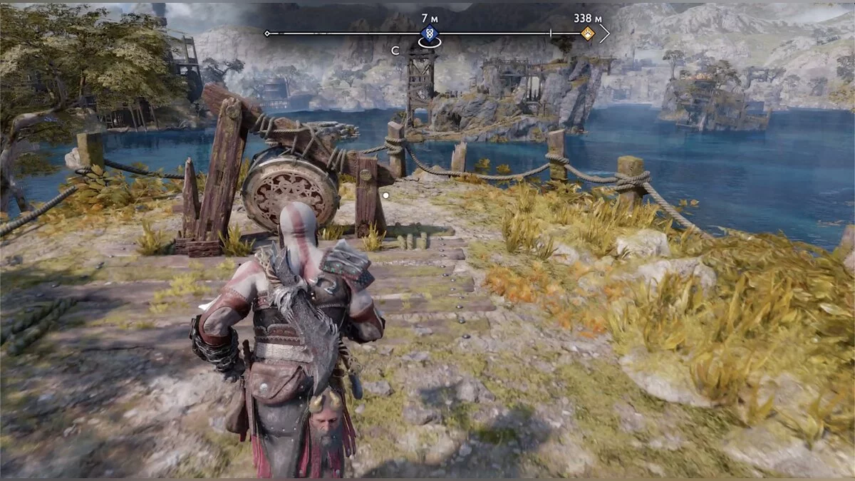Доплывите до буровой установки с той же правой стороны. На берегу Кратоса встретит Синдри, у которого можно улучшить снаряжение. Идите налево.