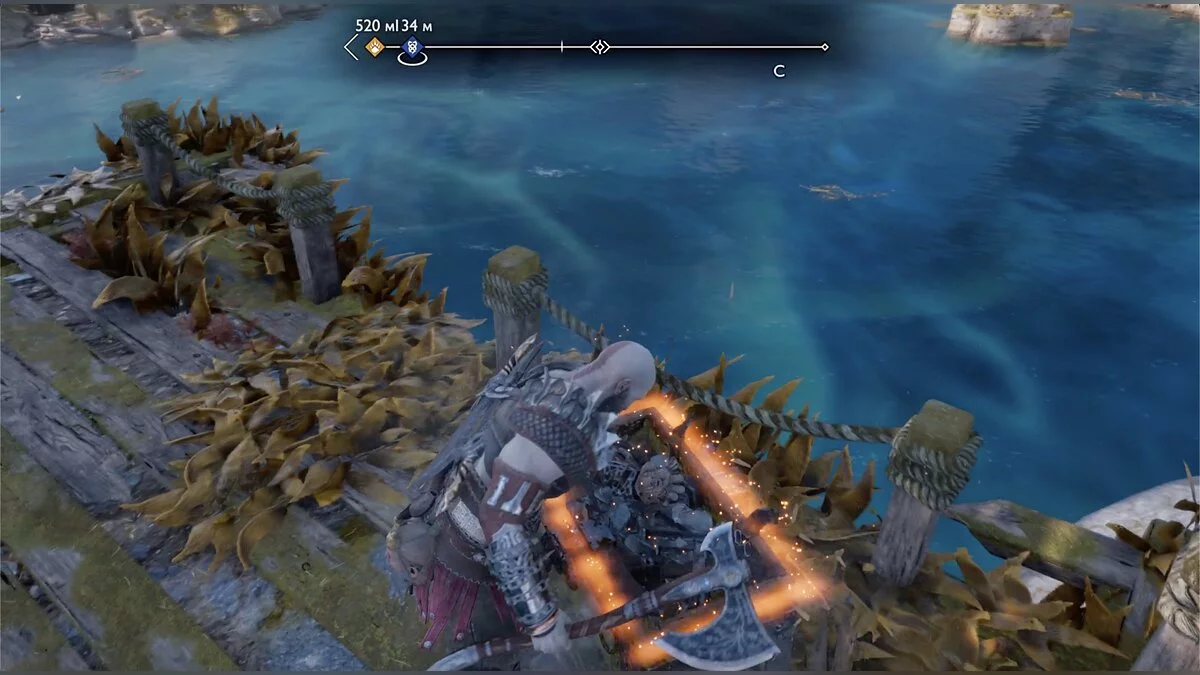 Найдите с левой стороны животного причал. Двигайтесь вперед и разберитесь с врагами. Держитесь правой стороны, чтобы найти доступную для взрыва смолу. Расчистите себе путь и срежьте первый из трех канатов, затем швырните топор в пломбу на плавнике — это предстоит сделать еще два раза.