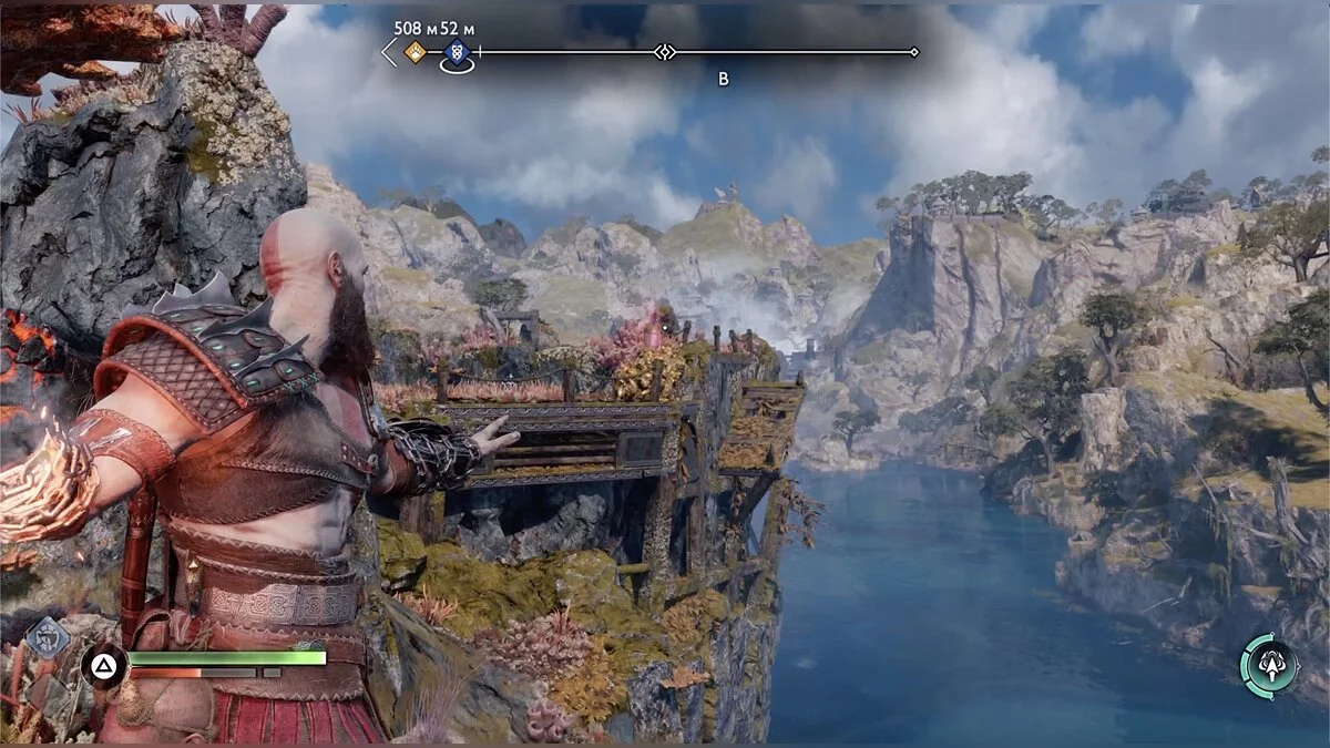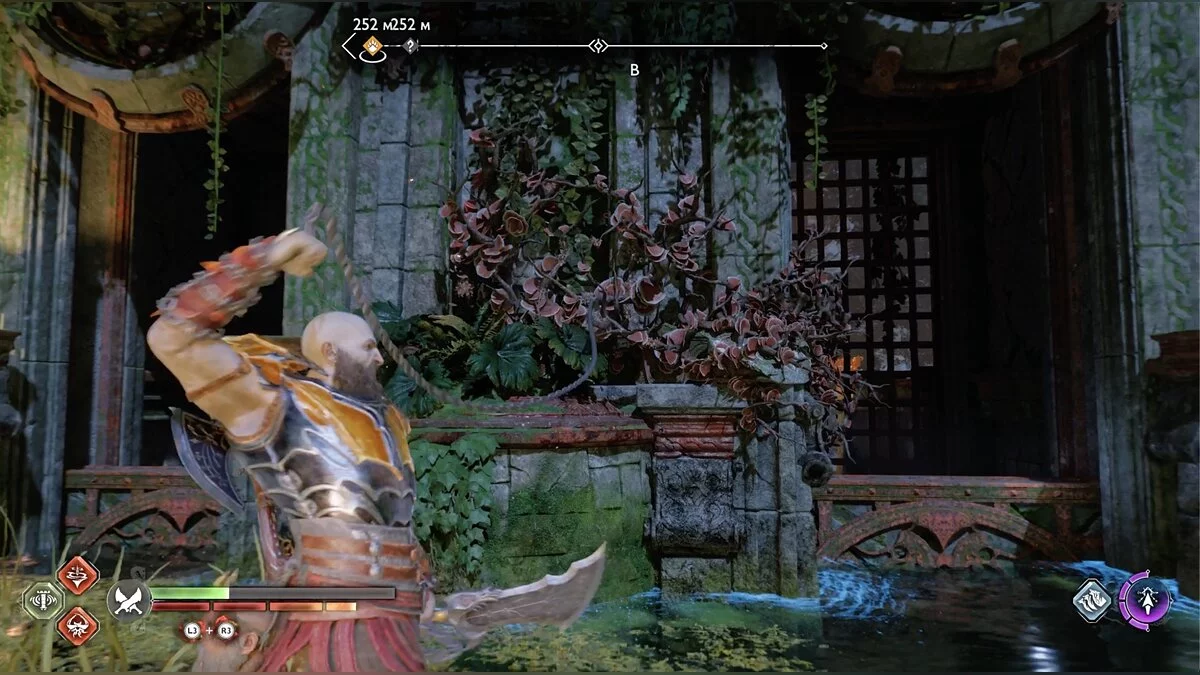 Получив копье Драупнир, посетите Нидавеллир. Там не так много мест для исследования. Вернитесь к тоннелю, через который Атрей и Кратос попали с пристани на большую улицу. Прямо после тоннеля заблокированный мост. Раньше преодолеть его было нельзя. Обратите внимание на место для копья чуть левее моста. Создайте перекладину и перепрыгните — там и растет цветок.