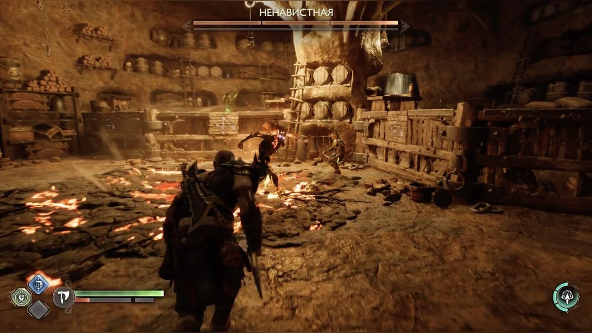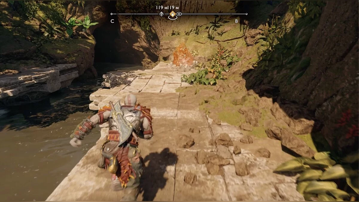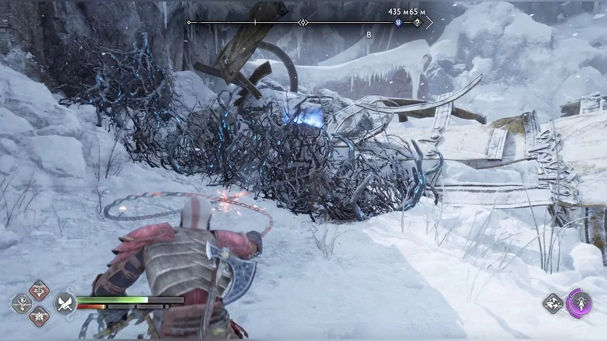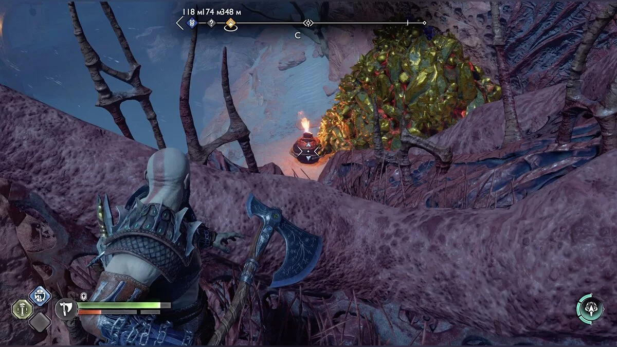Возвращайтесь в зону, где нашли метку легенд и перепрыгните на клинках на другую сторону. Откройте малый сундук и убейте врагов. Спускайтесь по цепи ко второму канату и срежьте его. На Кратоса и Атрея сразу же нападут ящерицы из гнезда. Уничтожьте его и обнаружите хранилище бомб. Теперь вы сможете взорвать смолу там, где не было подходящих горючих сосудов.