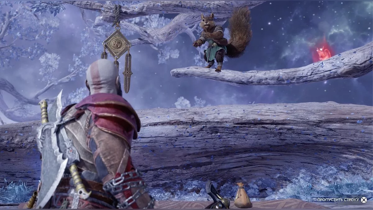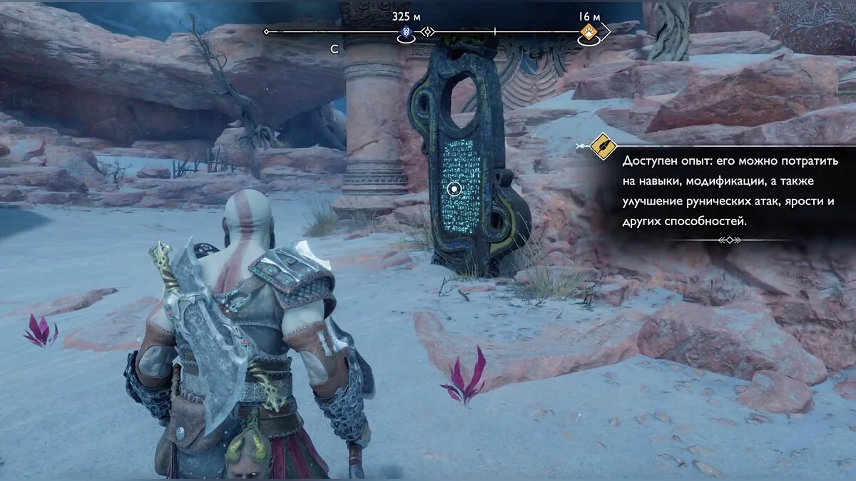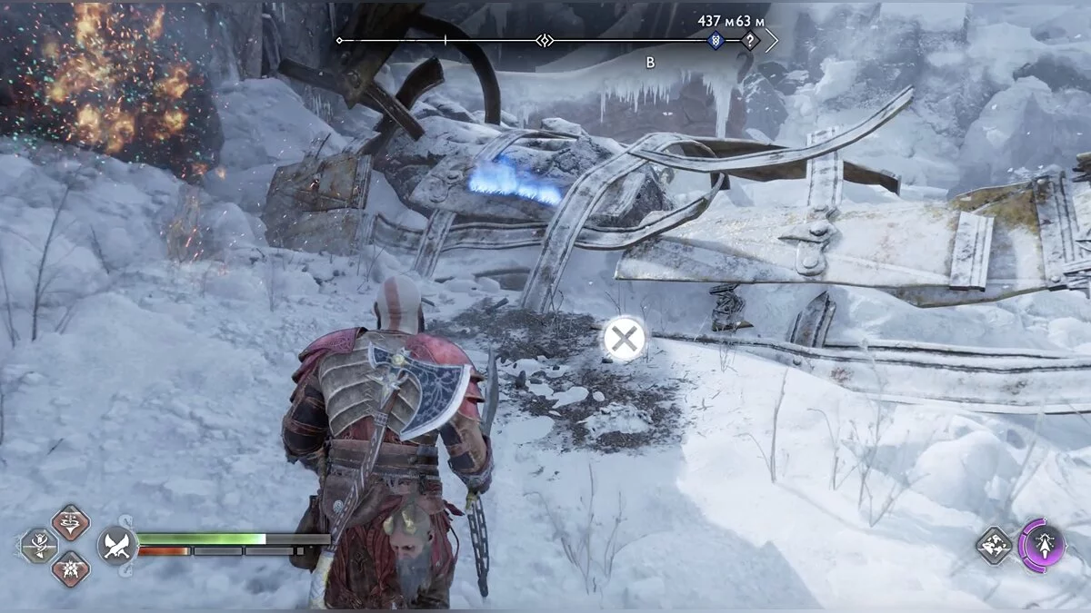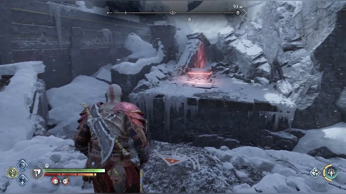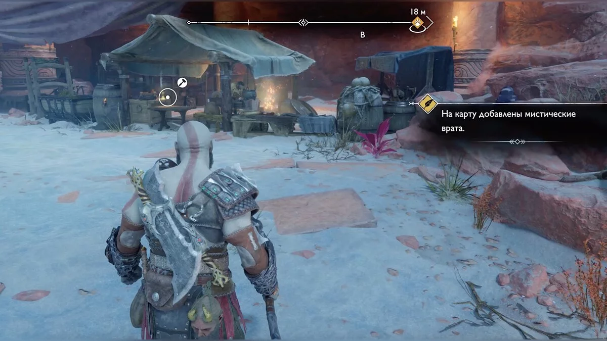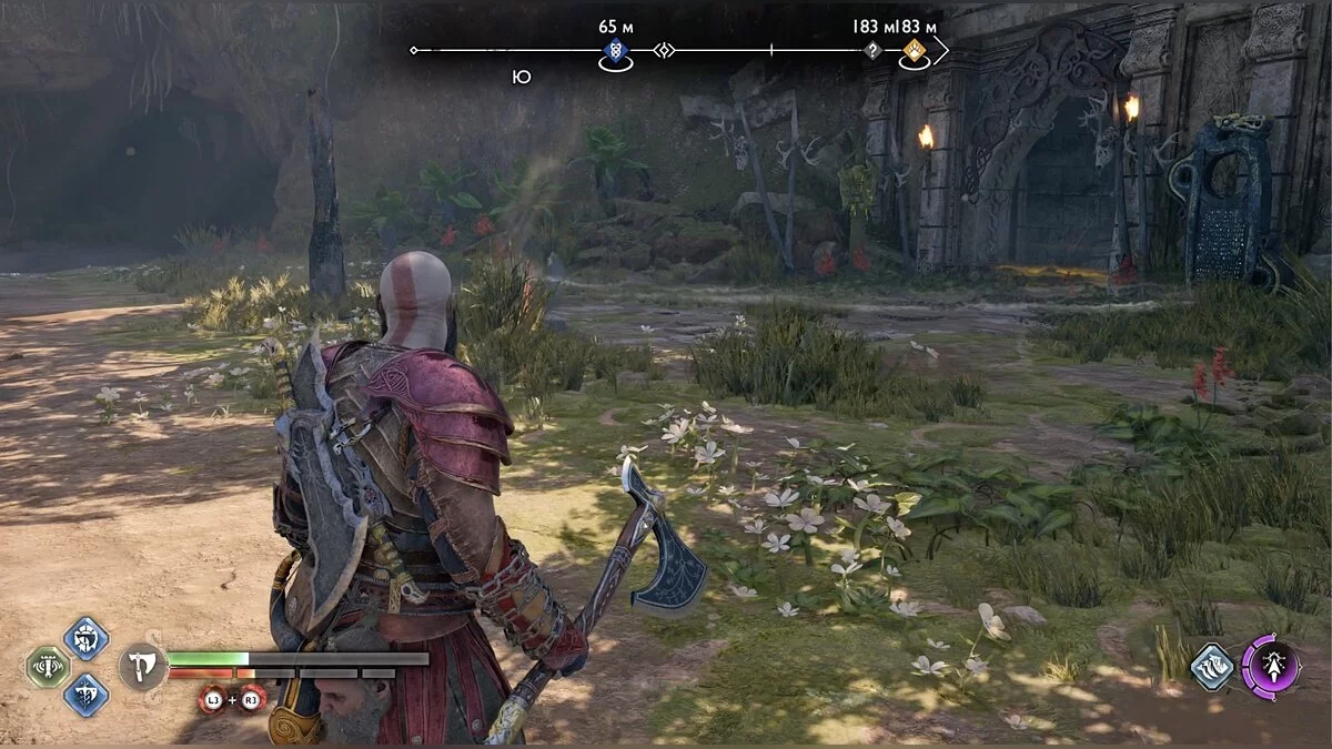 После завершения сюжета пообщайтесь с Рататоском. Получив благодаря белке доступ к новым мистическим вратам, отправляйтесь в Нифльхейм. Здесь вы в роли Кратоса еще не бывали. Сразу после врат — цветок. Также на большой локации можно найти могилу берсерка.