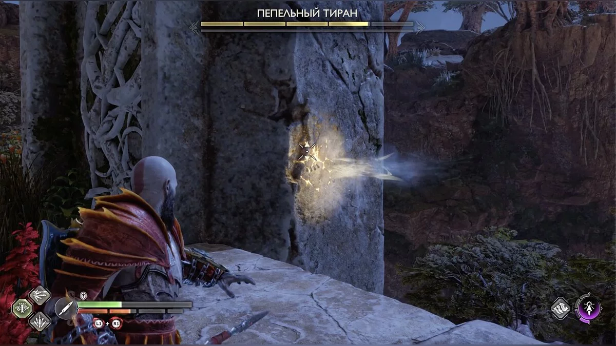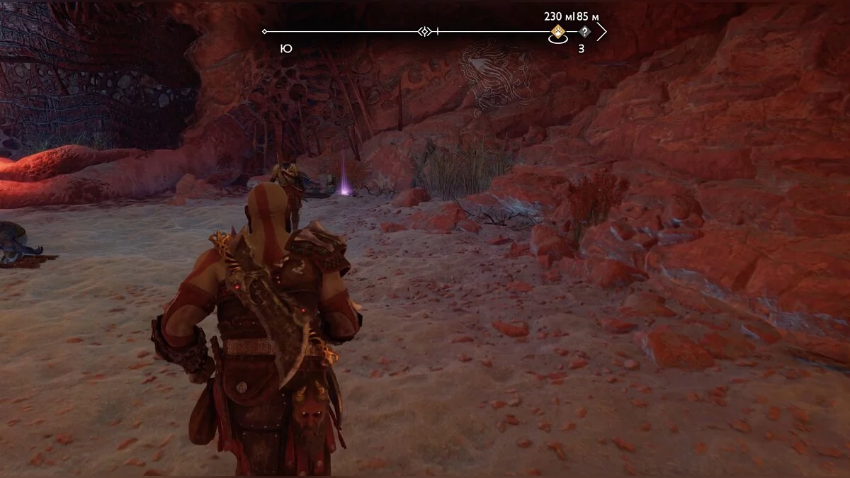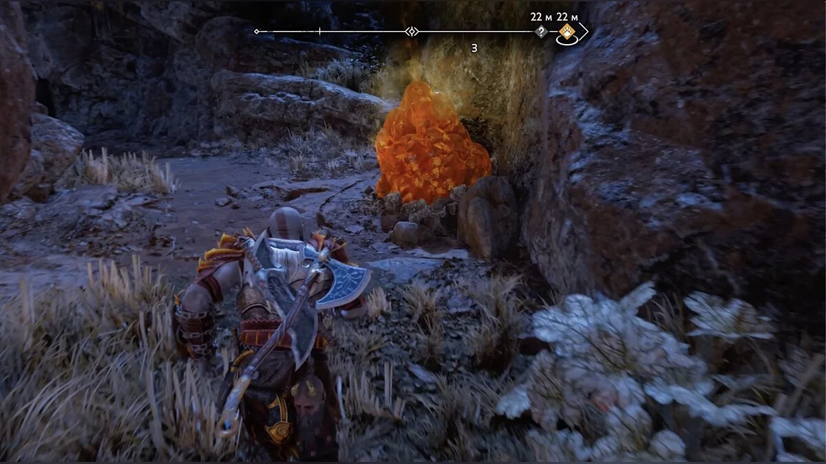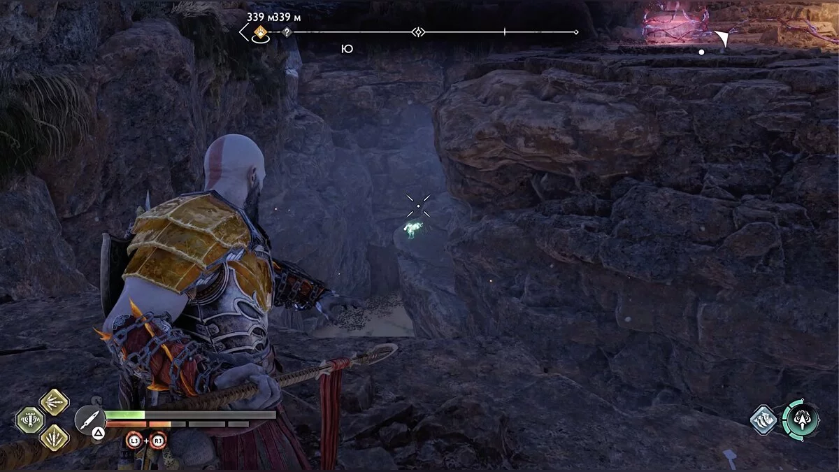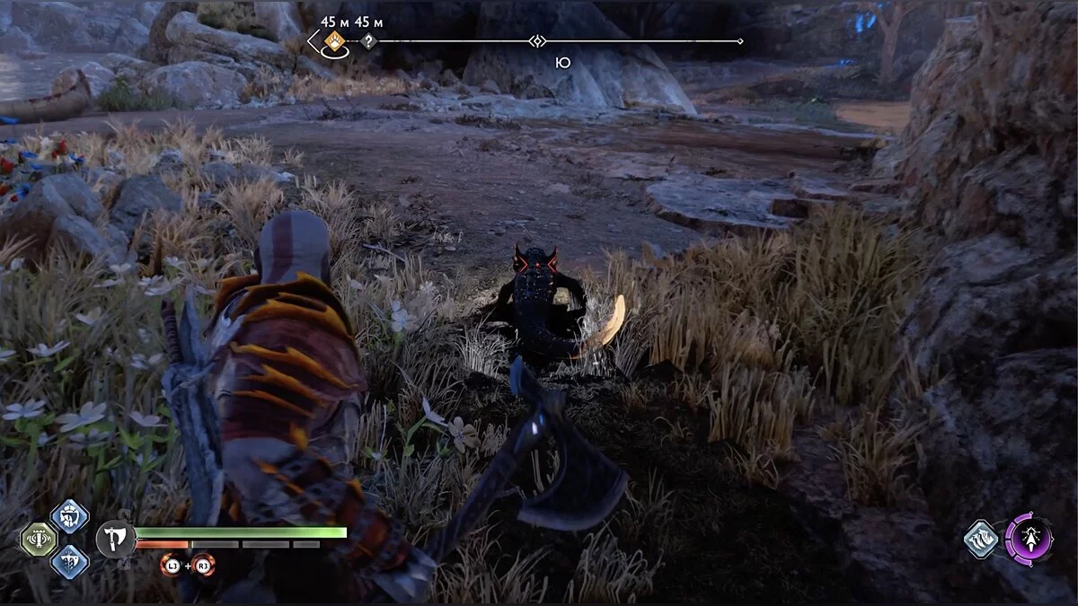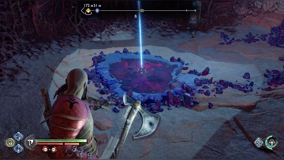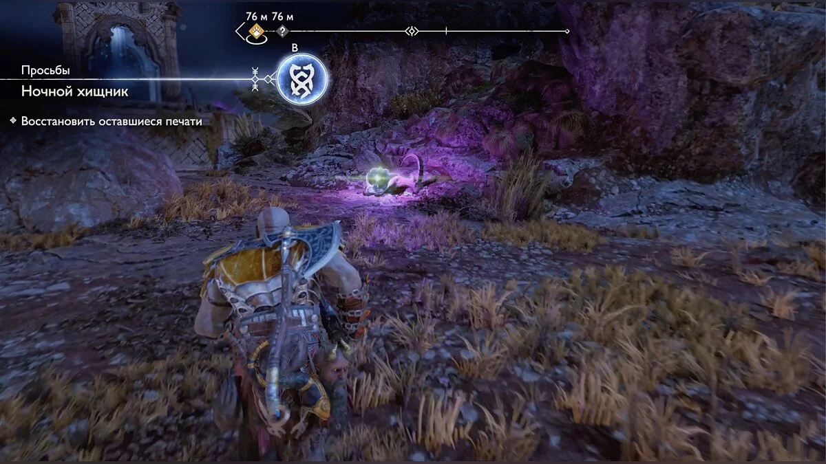 Чтобы найти эту просьбу, обязательно разыщите алтарь и установите ночь. От главного входа в Кратер идите в левую сторону, никуда не сворачивая. Спускайтесь с уступа и продолжайте держаться левой стороны. Перепрыгните пропасть и перепрыгните с помощью клинков в ранее недоступную часть локации. Как только вы поднимитесь на уступ, увидите рядом тушу животного. Атрей подскажет, что где-то поблизости Пожиратель душ. Это тот самый враг, которому нужно швырять в грудь его же осколки.