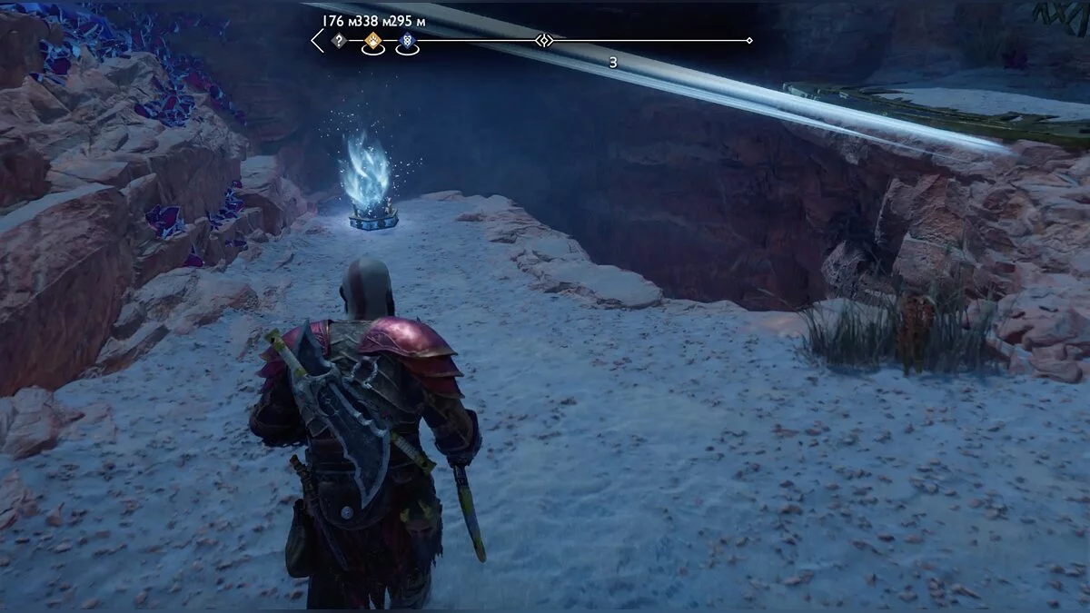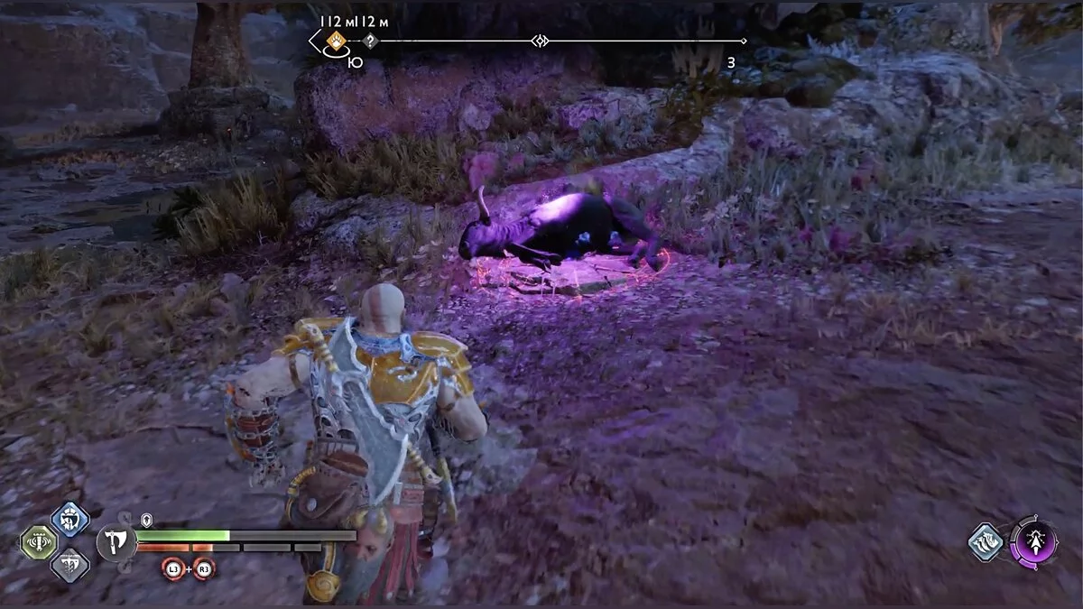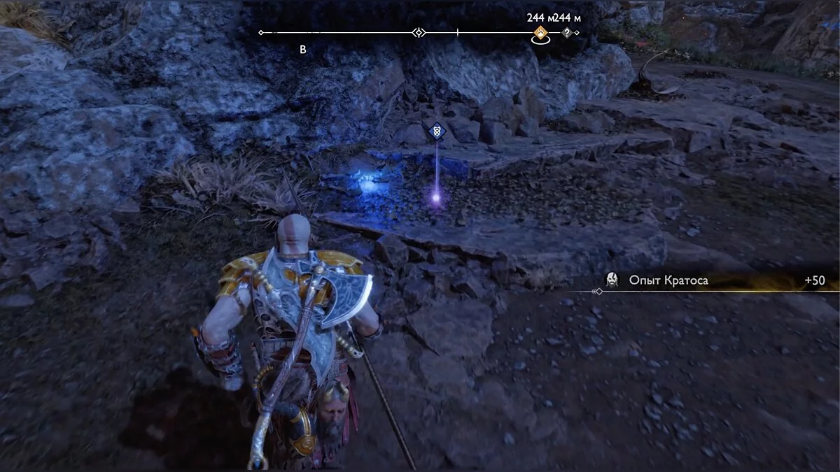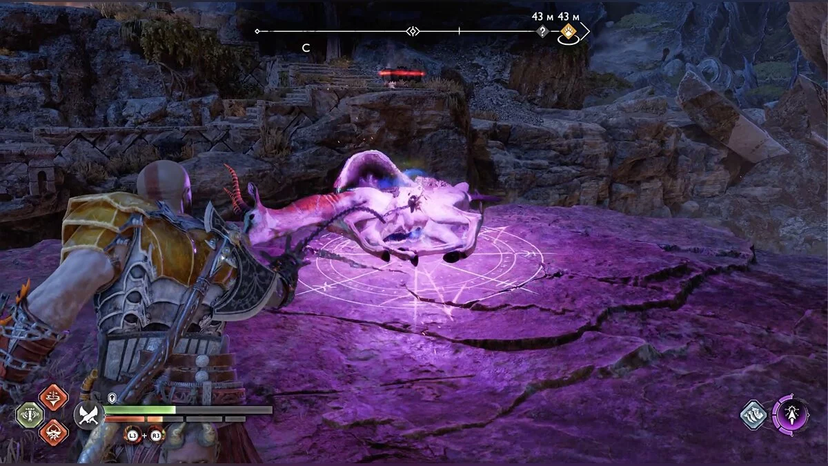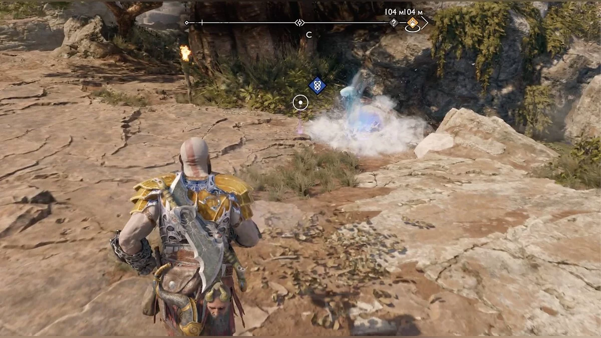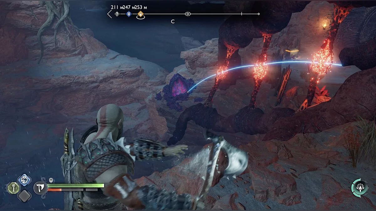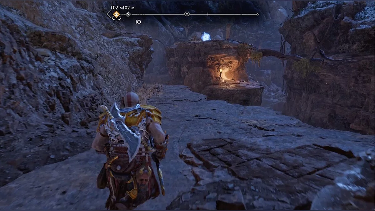Чтобы найти эту просьбу, обязательно разыщите алтарь и установите ночь. От главного входа в Кратер идите в левую сторону, никуда не сворачивая. Спускайтесь с уступа и продолжайте держаться левой стороны. Перепрыгните пропасть и перепрыгните с помощью клинков в ранее недоступную часть локации. Как только вы поднимитесь на уступ, увидите рядом тушу животного. Атрей подскажет, что где-то поблизости Пожиратель душ. Это тот самый враг, которому нужно швырять в грудь его же осколки.