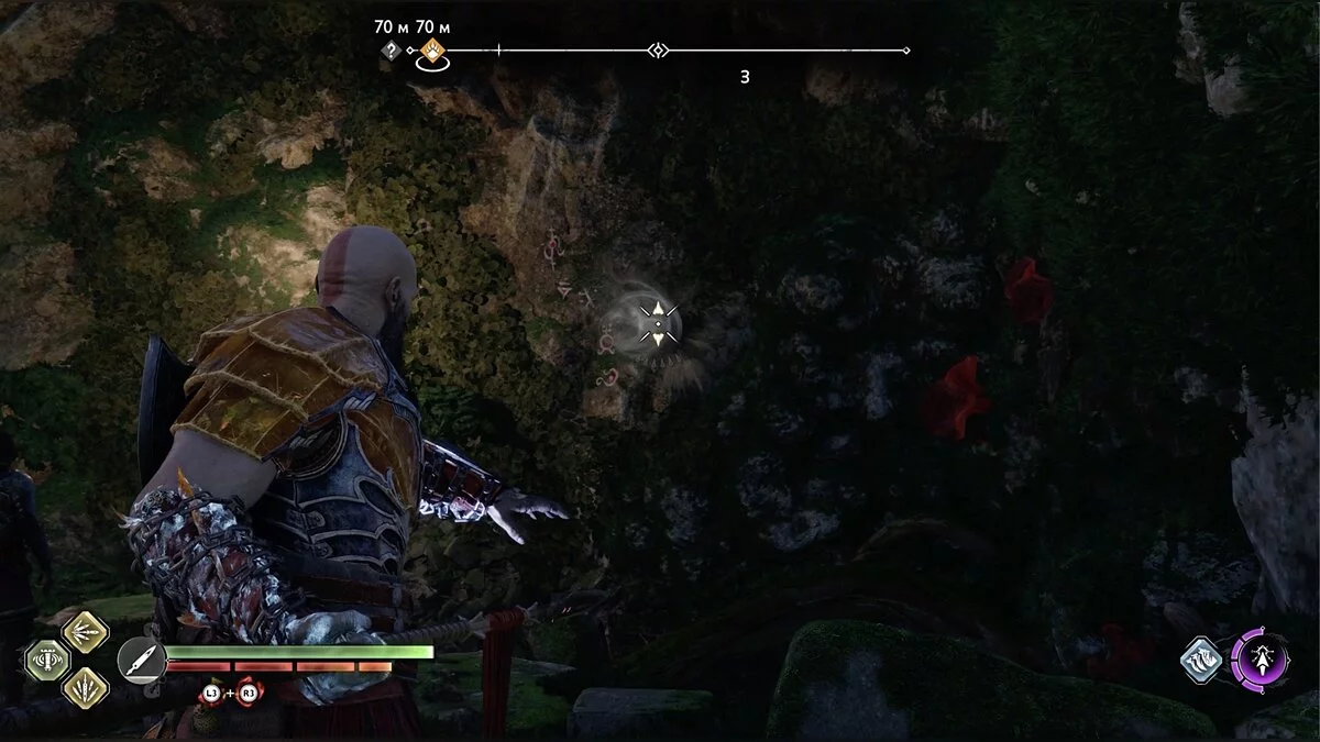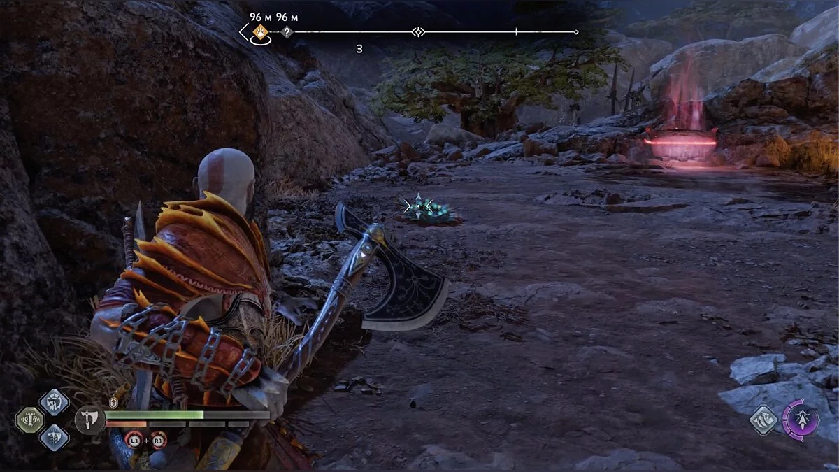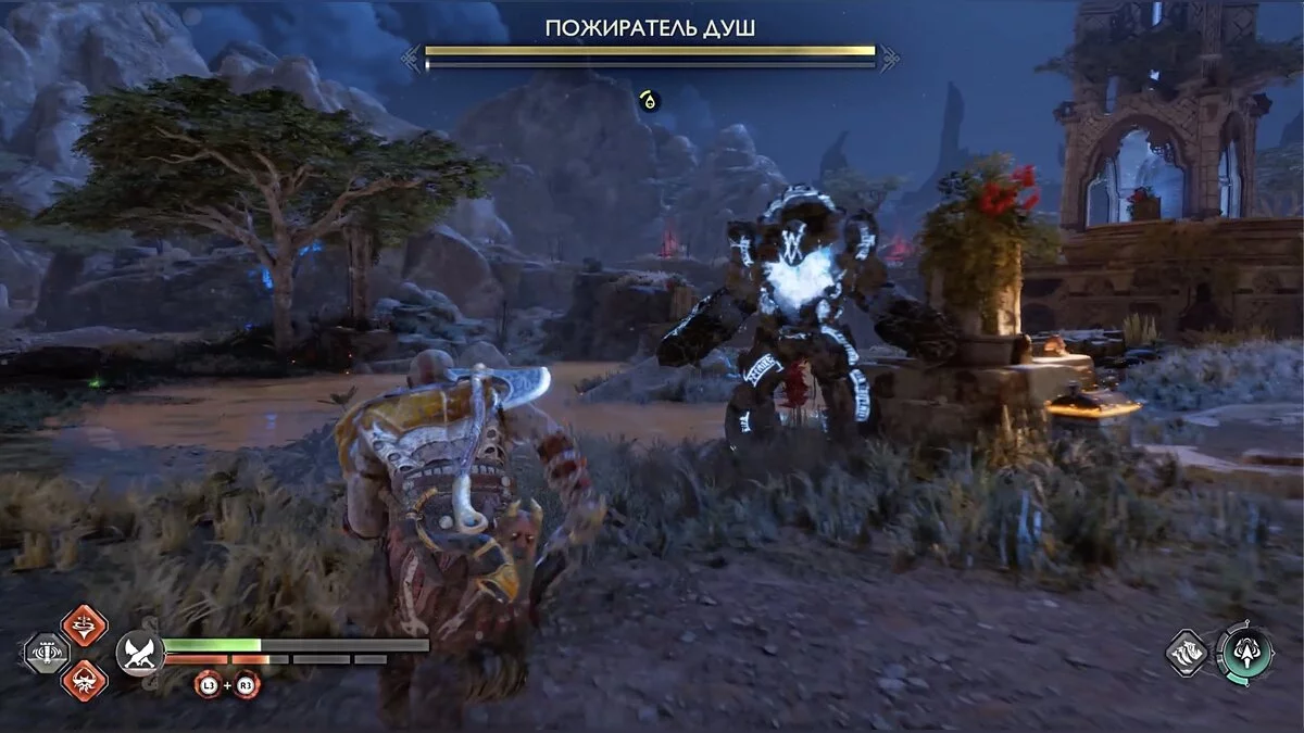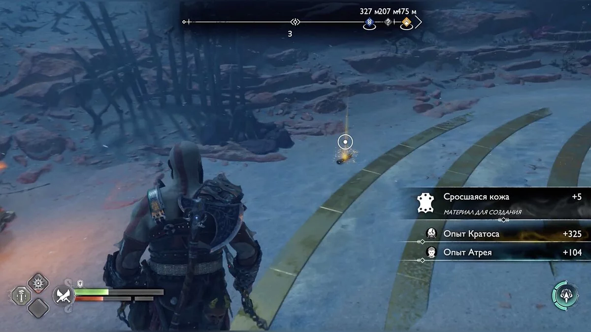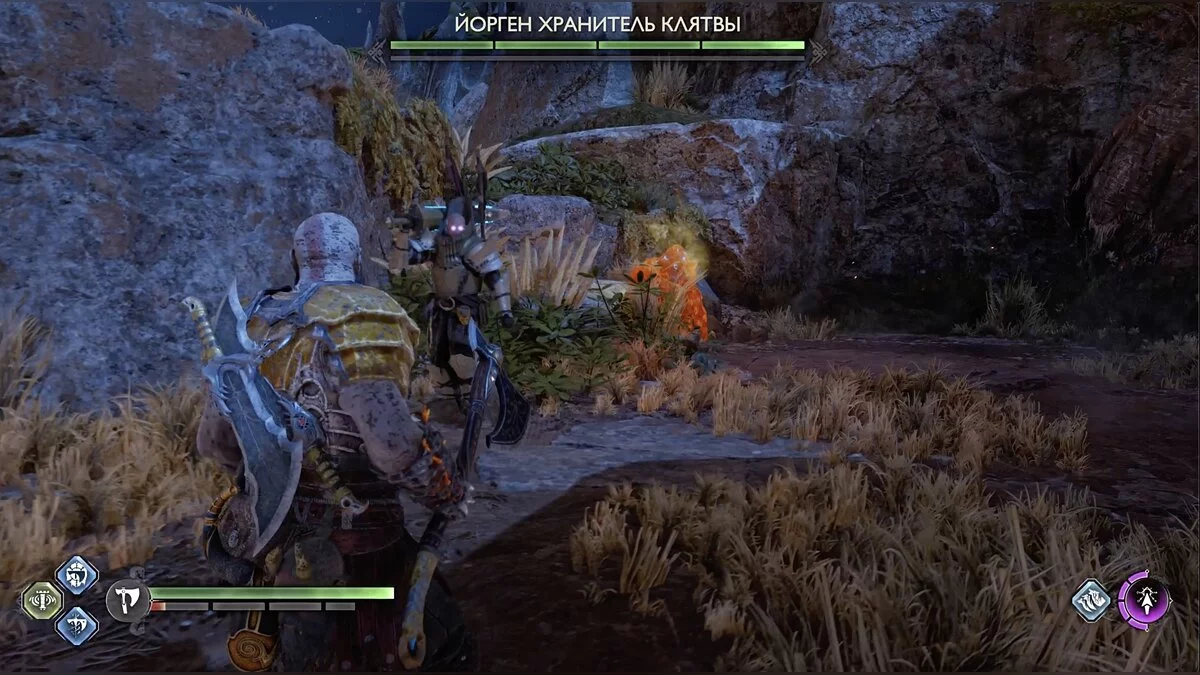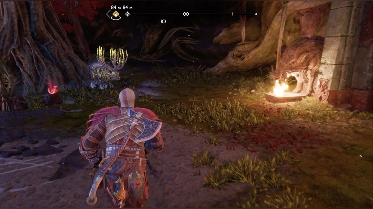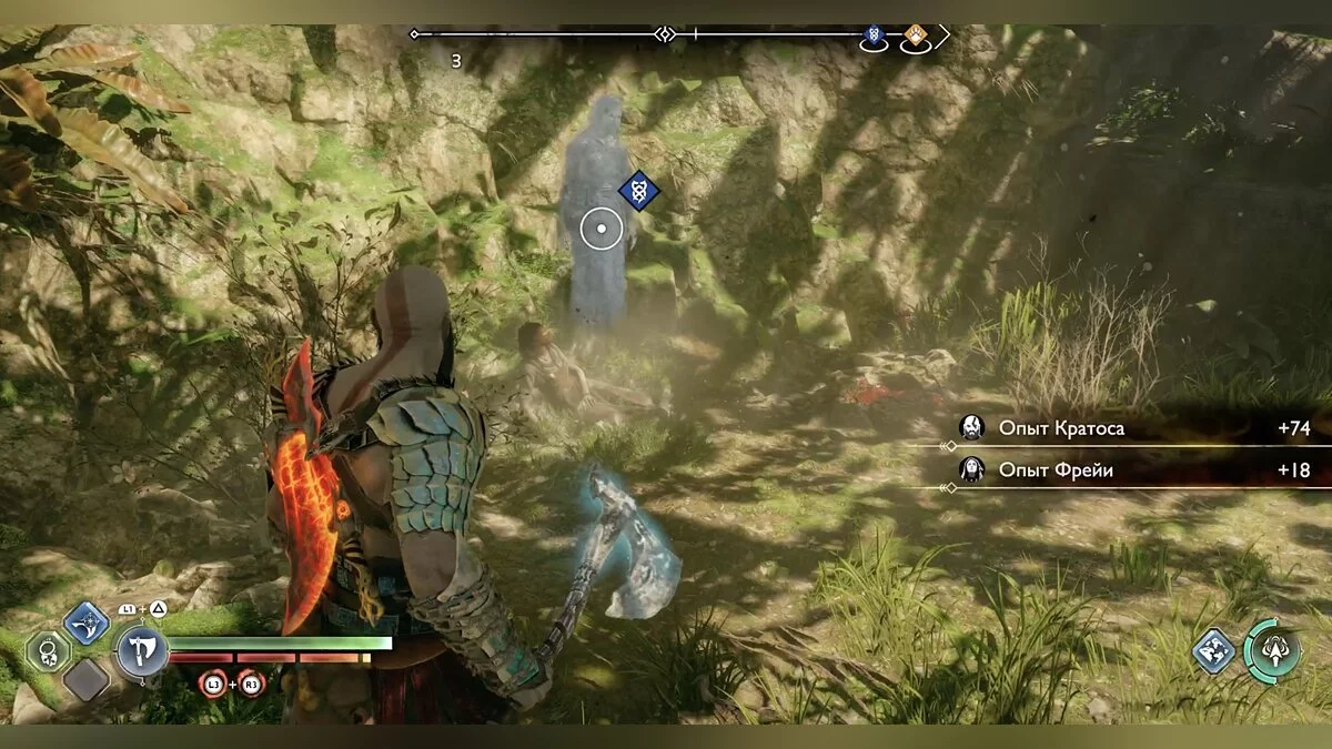 Чтобы найти эту просьбу, обязательно разыщите алтарь и установите ночь. От главного входа в Кратер идите в левую сторону, никуда не сворачивая. Спускайтесь с уступа и продолжайте держаться левой стороны. Перепрыгните пропасть и перепрыгните с помощью клинков в ранее недоступную часть локации. Как только вы поднимитесь на уступ, увидите рядом тушу животного. Атрей подскажет, что где-то поблизости Пожиратель душ. Это тот самый враг, которому нужно швырять в грудь его же осколки.