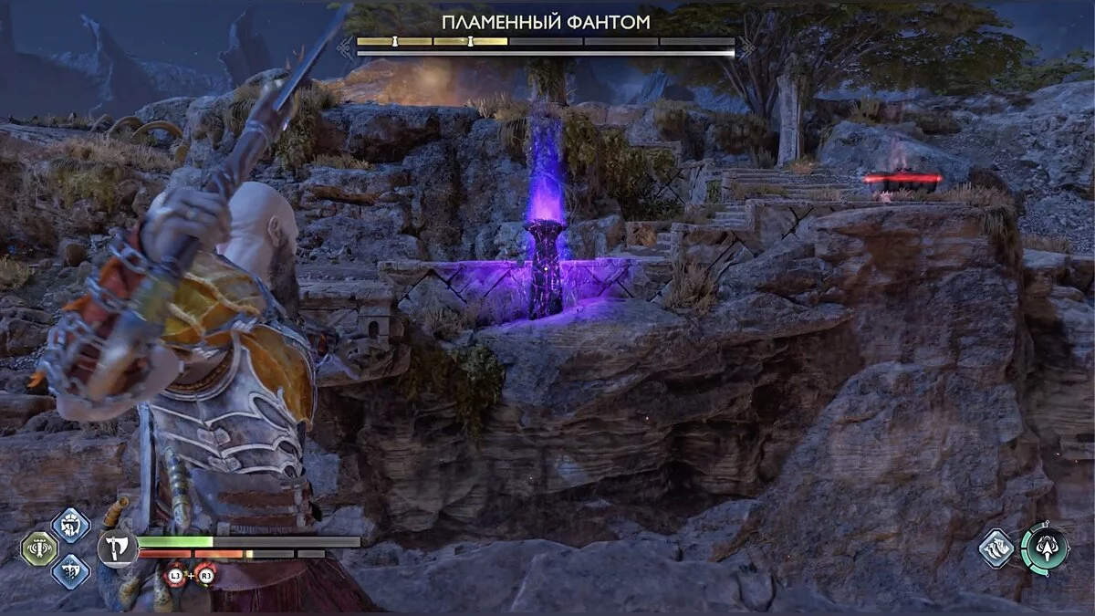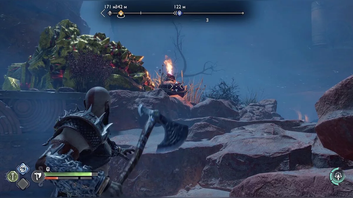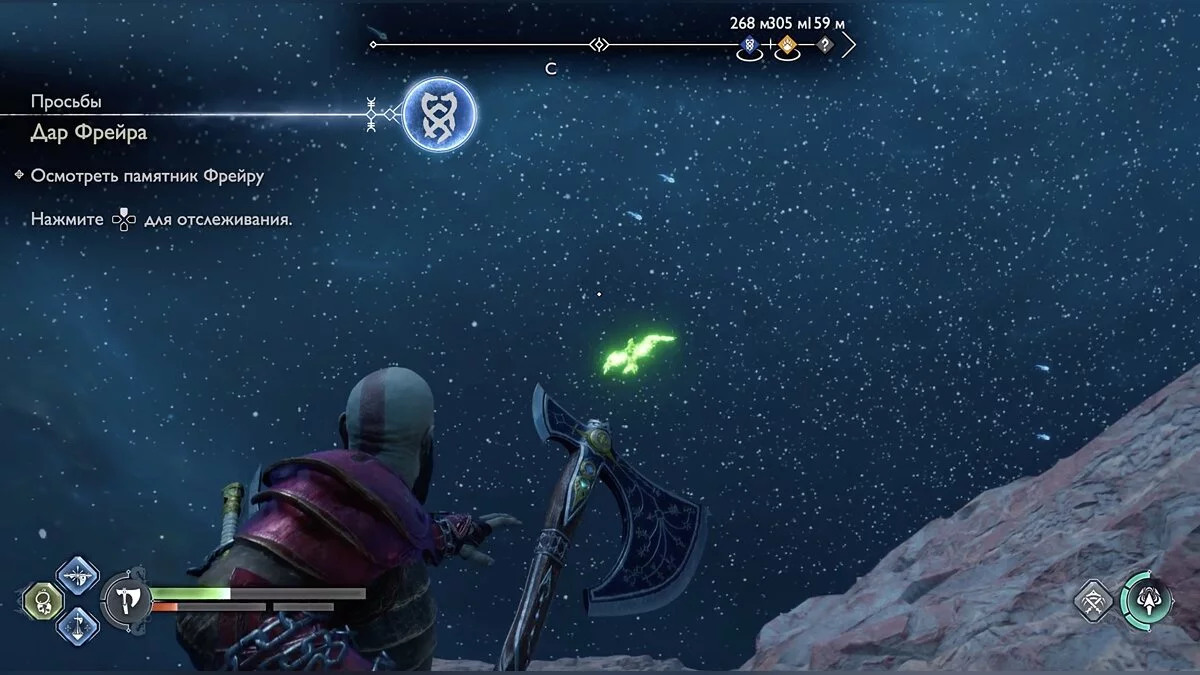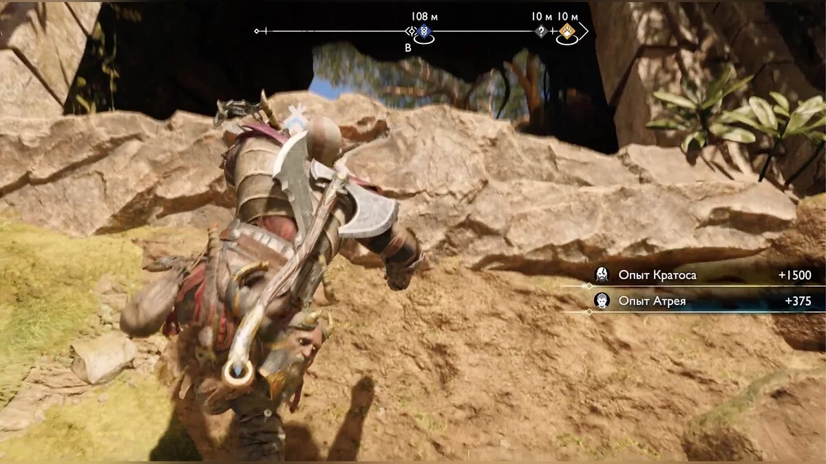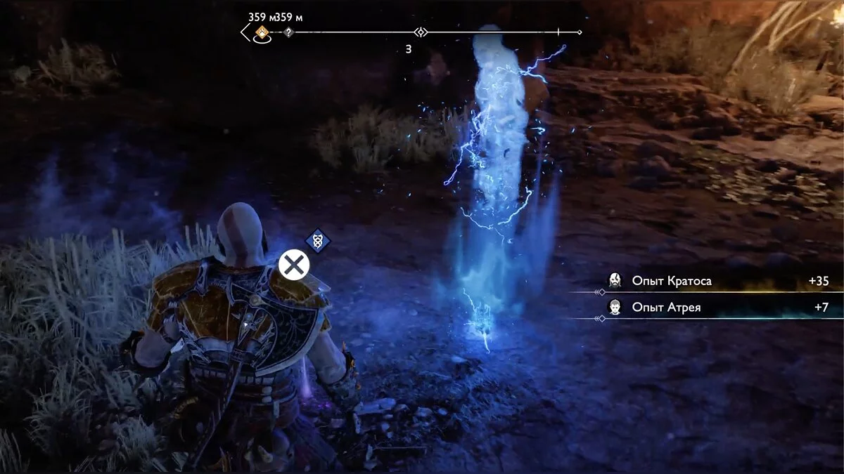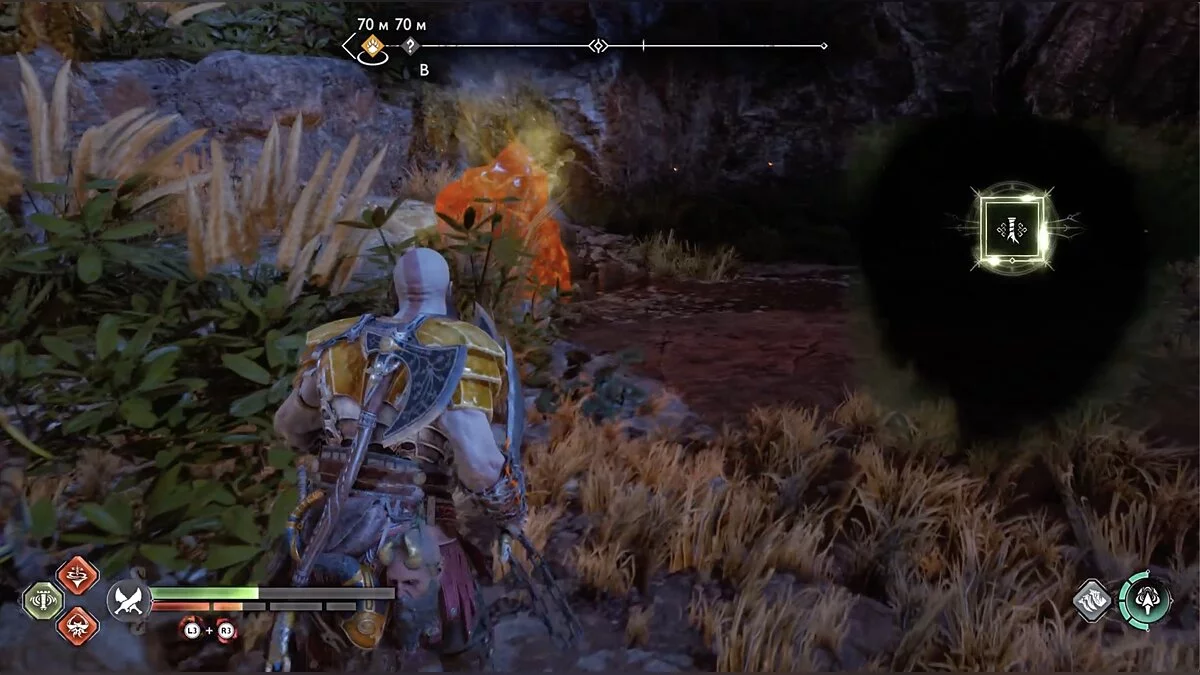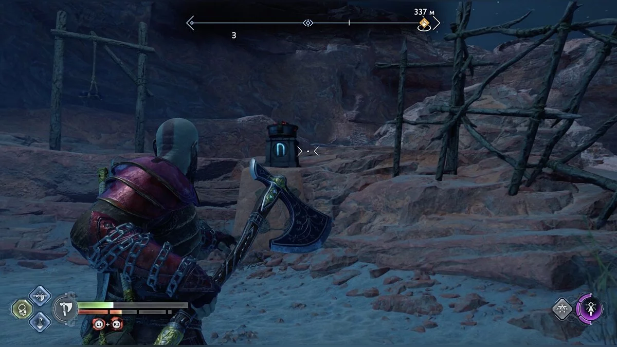 Чтобы найти эту просьбу, обязательно разыщите алтарь и установите ночь. От главного входа в Кратер идите в левую сторону, никуда не сворачивая. Спускайтесь с уступа и продолжайте держаться левой стороны. Перепрыгните пропасть и перепрыгните с помощью клинков в ранее недоступную часть локации. Как только вы поднимитесь на уступ, увидите рядом тушу животного. Атрей подскажет, что где-то поблизости Пожиратель душ. Это тот самый враг, которому нужно швырять в грудь его же осколки.