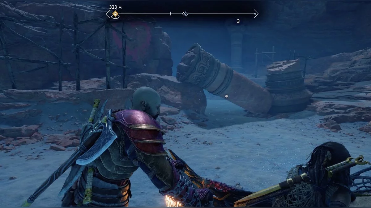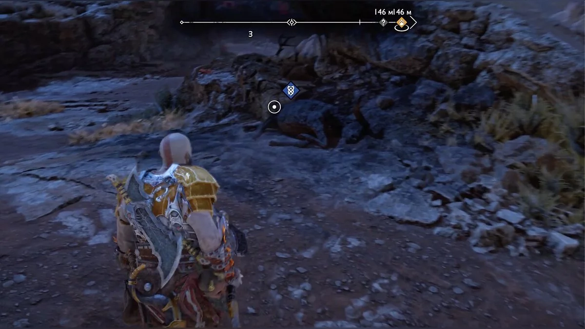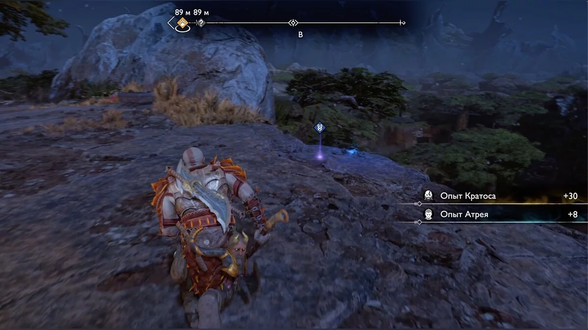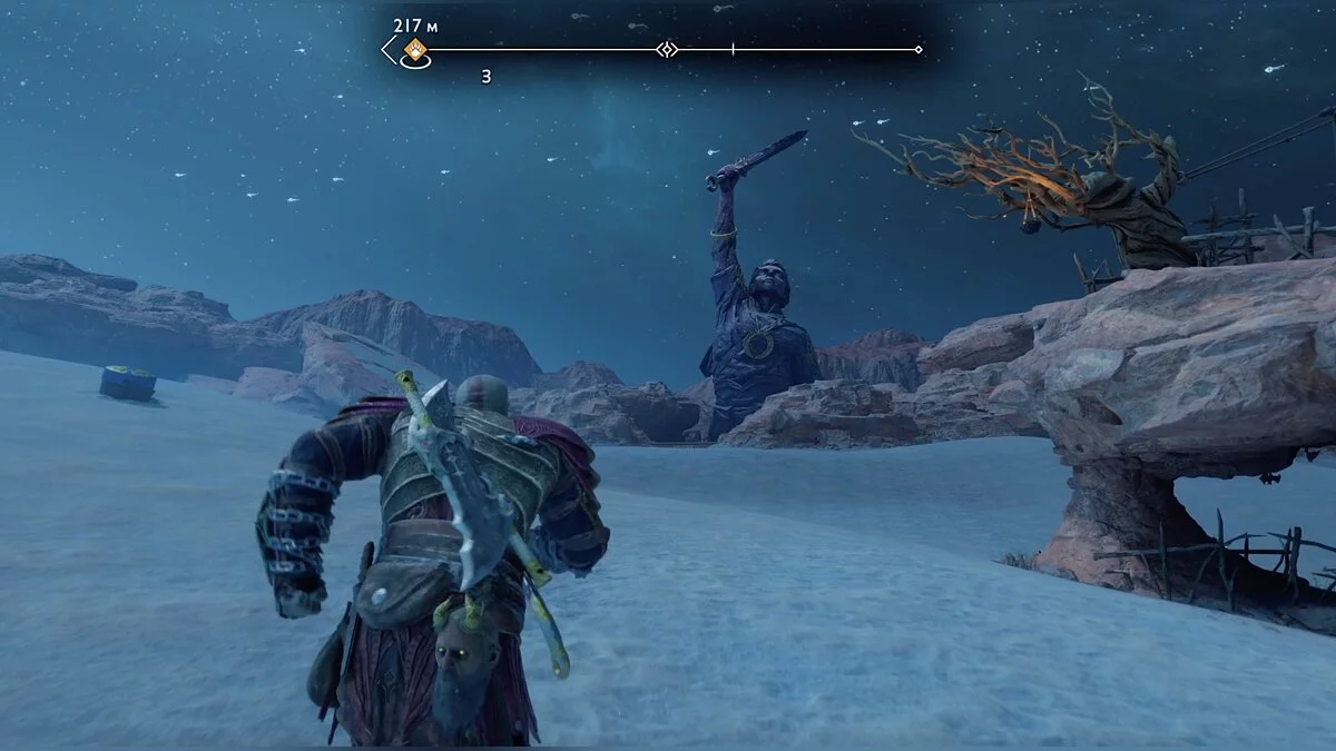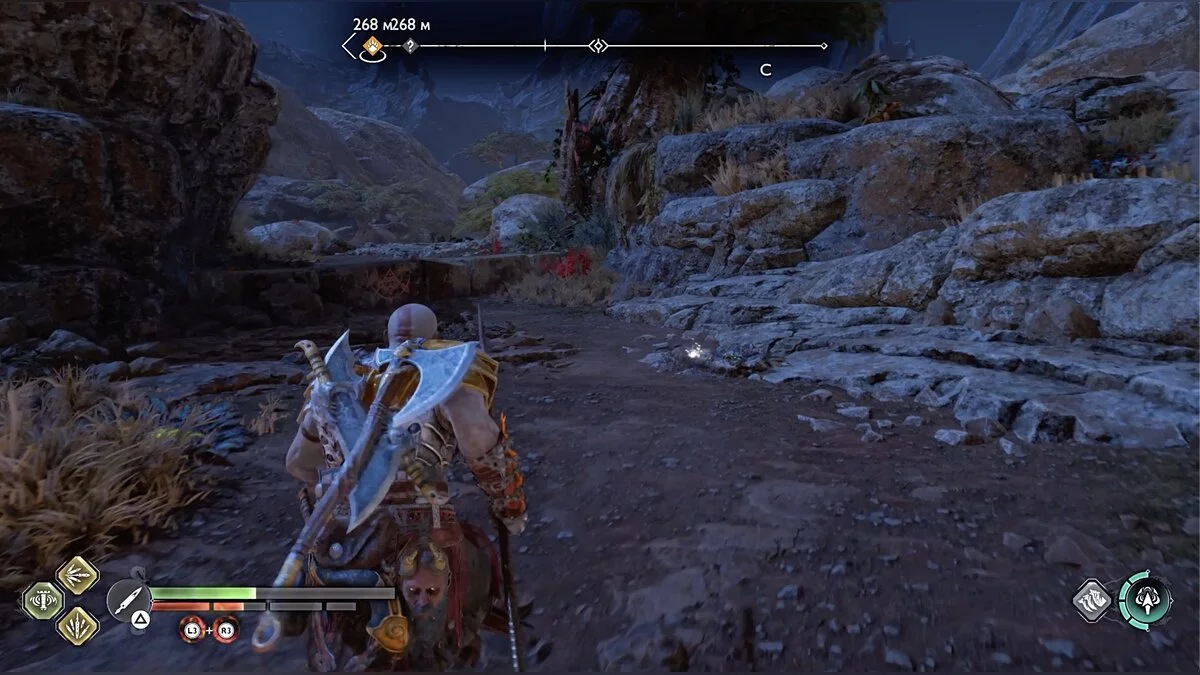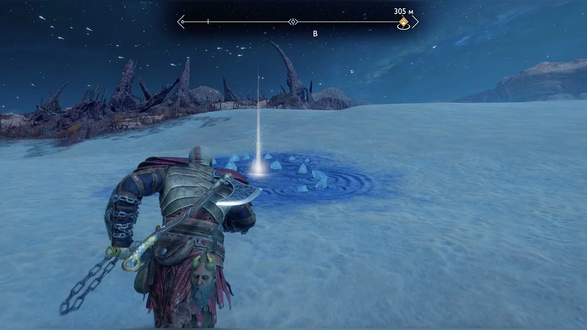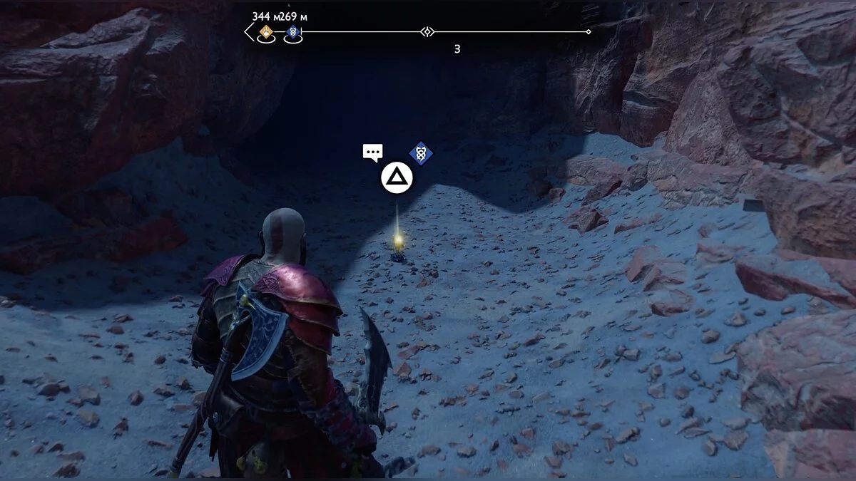 Чтобы найти эту просьбу, обязательно разыщите алтарь и установите ночь. От главного входа в Кратер идите в левую сторону, никуда не сворачивая. Спускайтесь с уступа и продолжайте держаться левой стороны. Перепрыгните пропасть и перепрыгните с помощью клинков в ранее недоступную часть локации. Как только вы поднимитесь на уступ, увидите рядом тушу животного. Атрей подскажет, что где-то поблизости Пожиратель душ. Это тот самый враг, которому нужно швырять в грудь его же осколки.