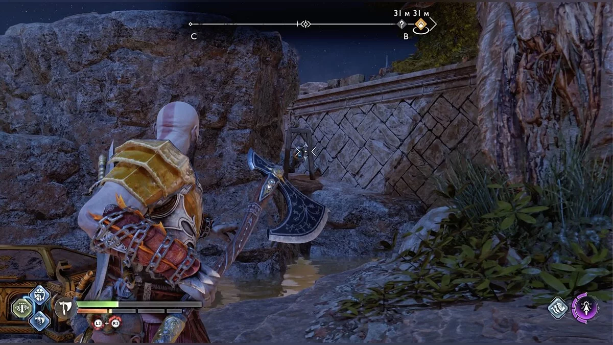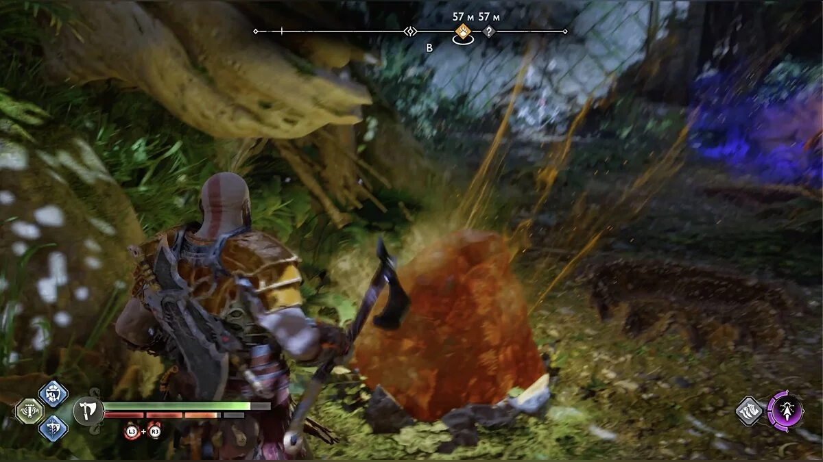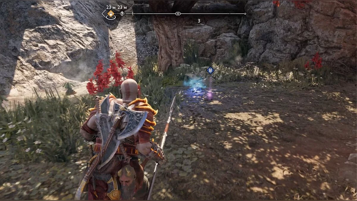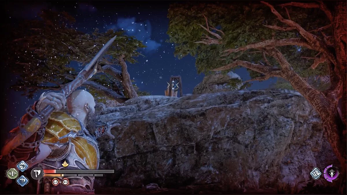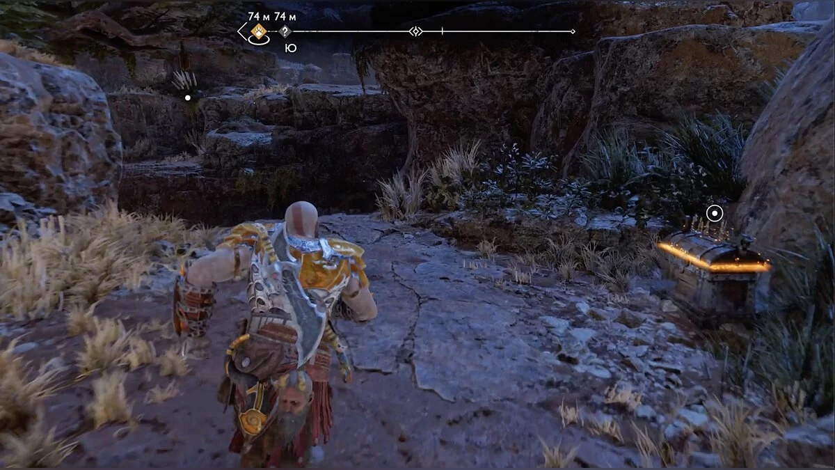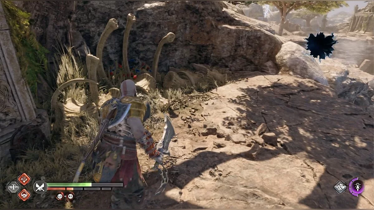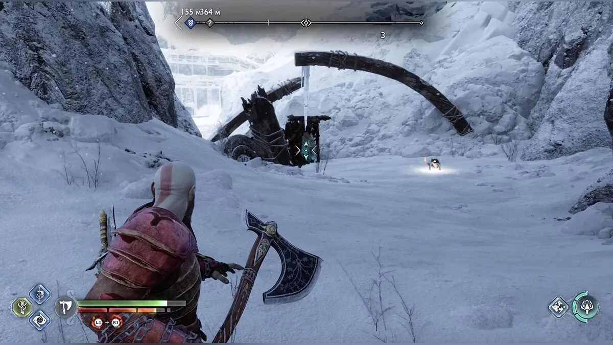 Чтобы найти эту просьбу, обязательно разыщите алтарь и установите ночь. От главного входа в Кратер идите в левую сторону, никуда не сворачивая. Спускайтесь с уступа и продолжайте держаться левой стороны. Перепрыгните пропасть и перепрыгните с помощью клинков в ранее недоступную часть локации. Как только вы поднимитесь на уступ, увидите рядом тушу животного. Атрей подскажет, что где-то поблизости Пожиратель душ. Это тот самый враг, которому нужно швырять в грудь его же осколки.