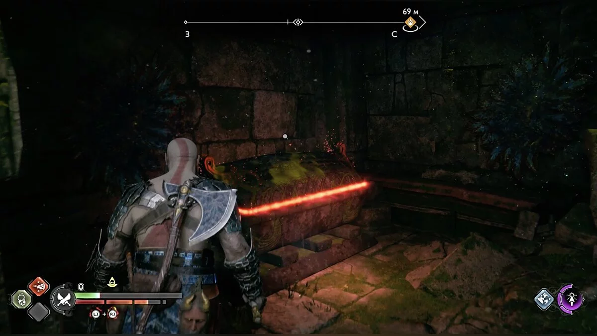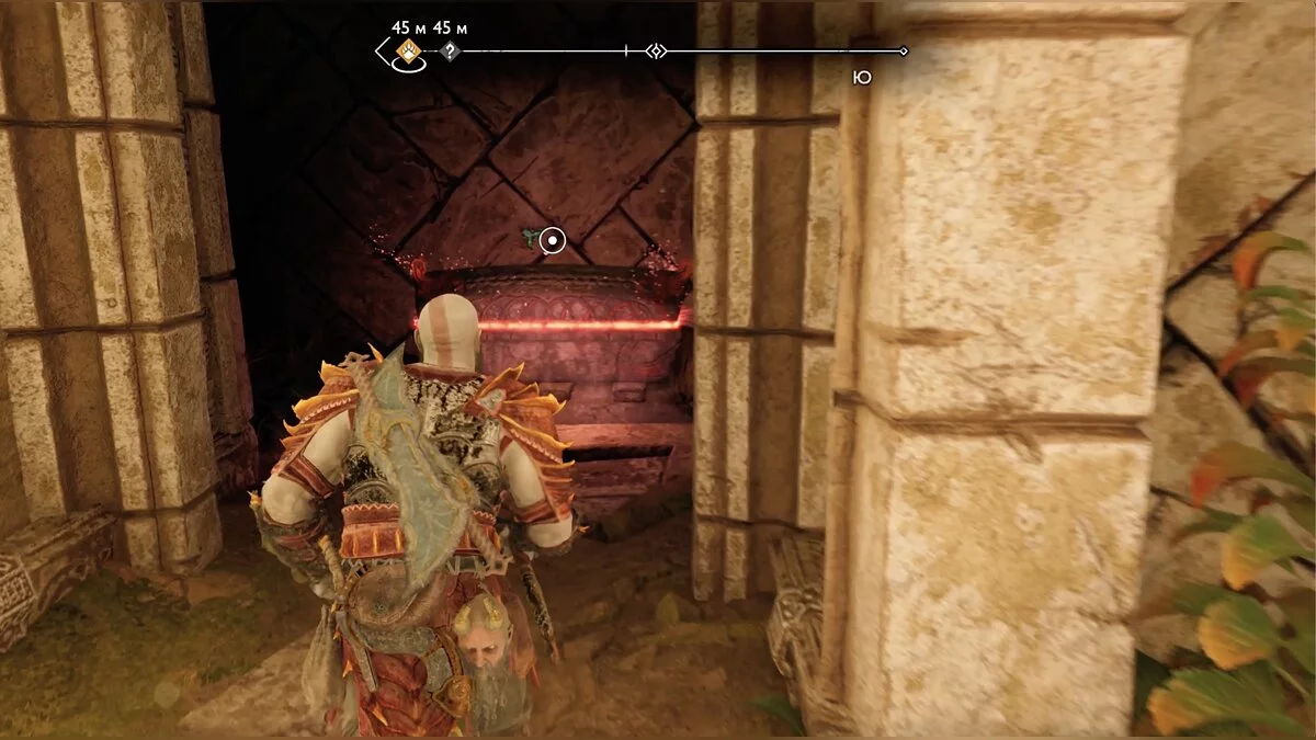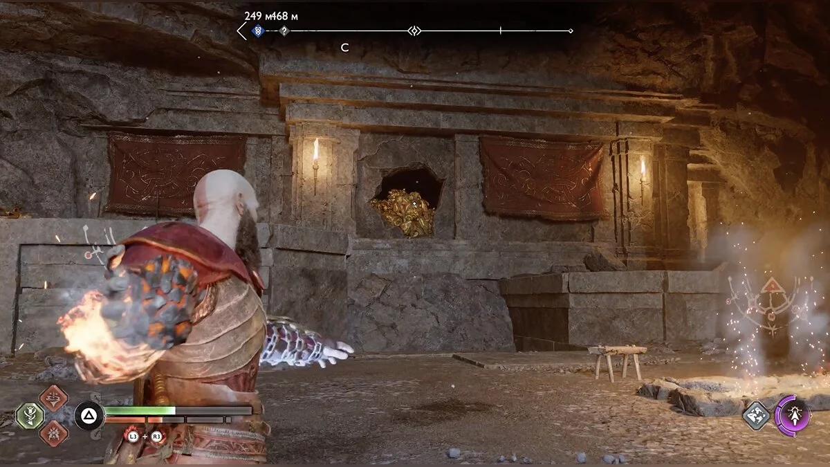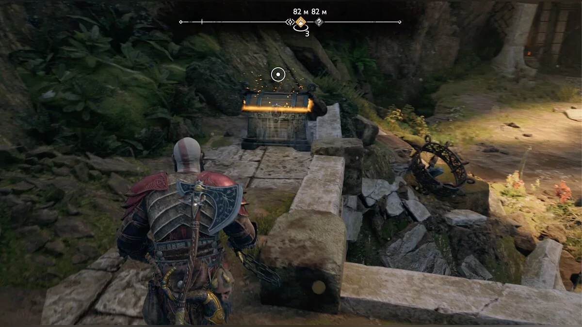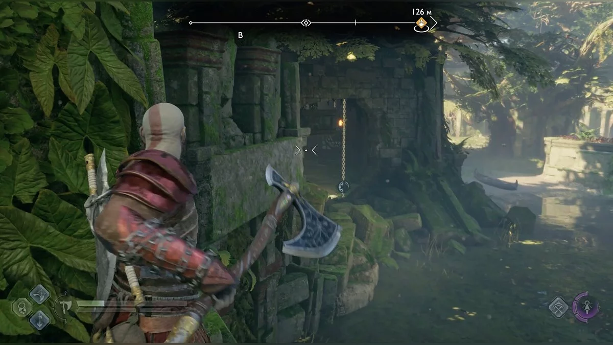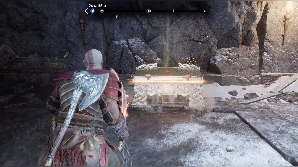 Слева есть отметка для пролома стены. Раскачайтесь на сцепке и нажмите нужную кнопку, чтобы Кратос попал в секретную зону. В конце коридора стоит большой сундук.