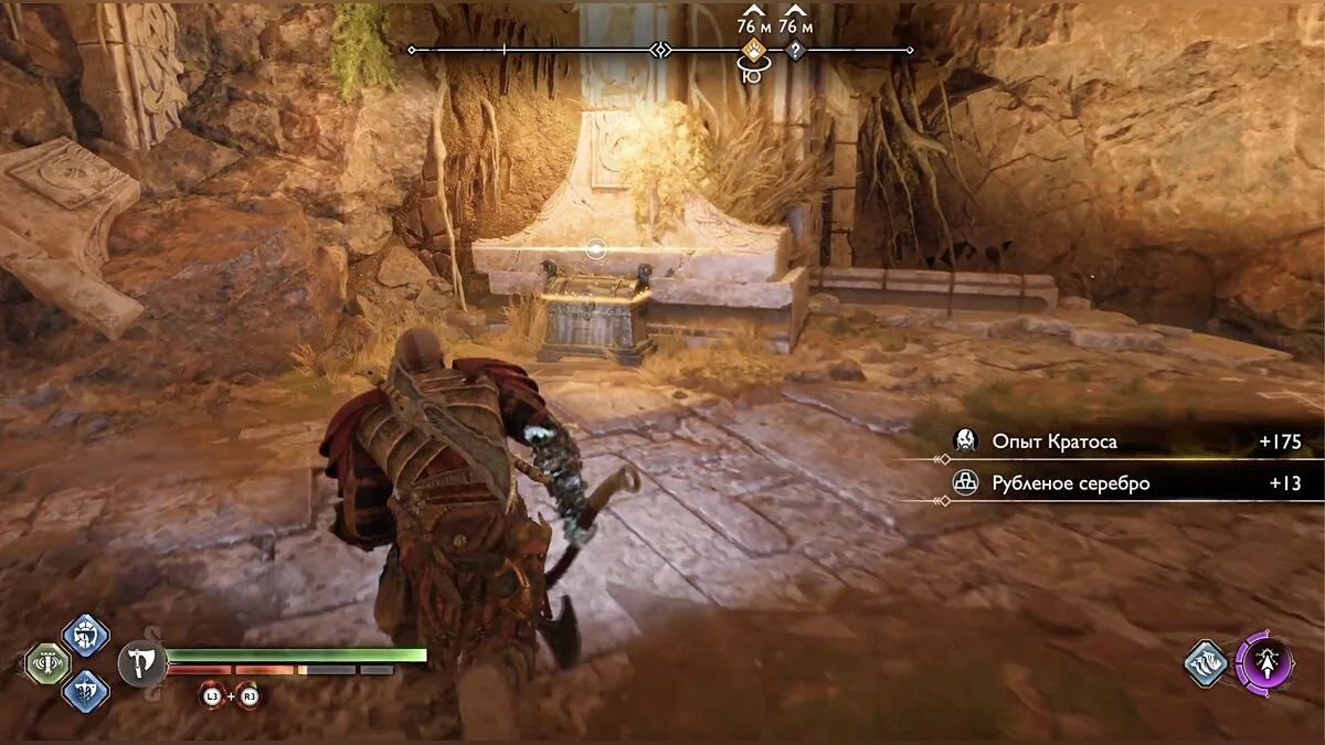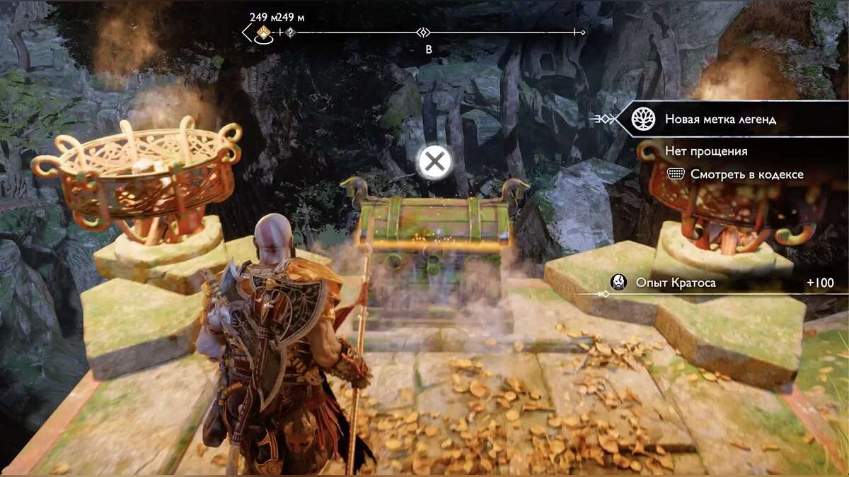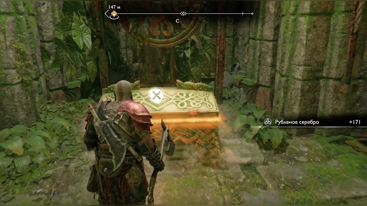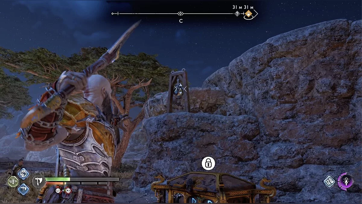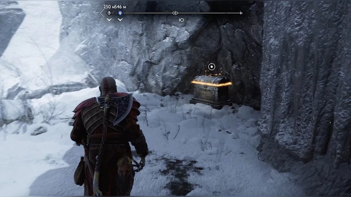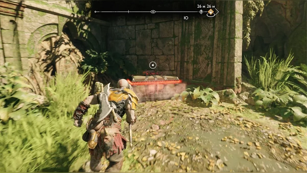 Слева есть отметка для пролома стены. Раскачайтесь на сцепке и нажмите нужную кнопку, чтобы Кратос попал в секретную зону. В конце коридора стоит большой сундук.