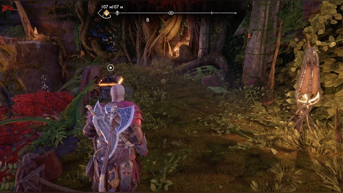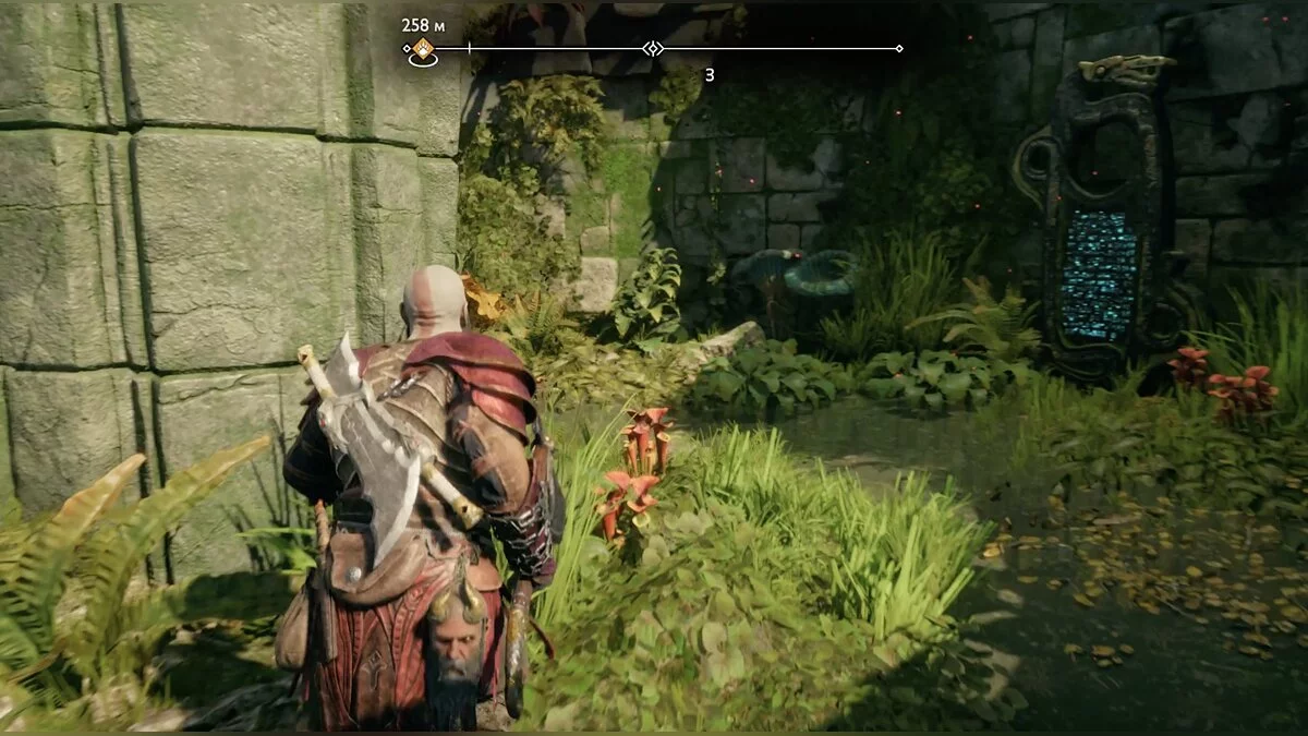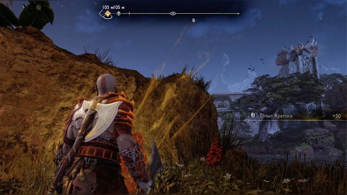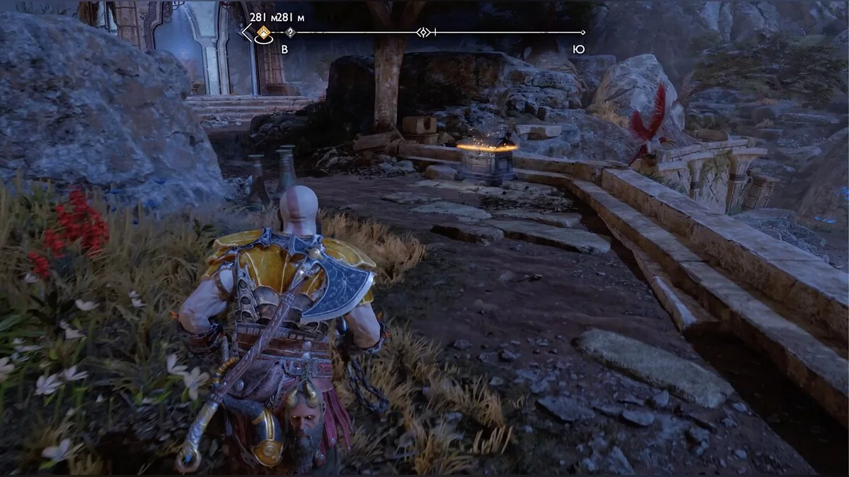 Цветок можно найти, если добраться до круглых руин по воде. Подробнее об этом в предыдущем квесте. Станьте лицом к кругу и идите налево — Кратос сразу заметит цветок.