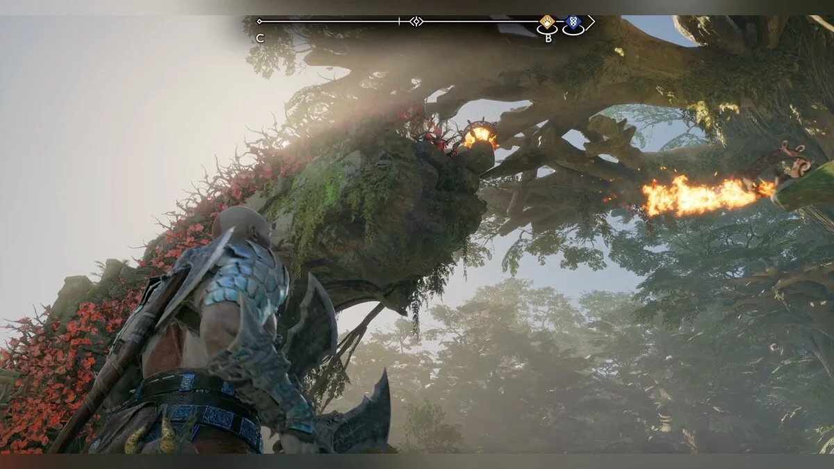 Добраться до противника нетрудно, но нужно знать, куда идти. Отправляйтесь на берег с алтарем времени суток. Сделайте день и изучите стену справа. Заберитесь, двигайтесь вперед до колючих лиан и сожгите их, чтобы перепрыгнуть большую пропасть. Подробнее мы пишем об этом в квесте «За Ванахейм».