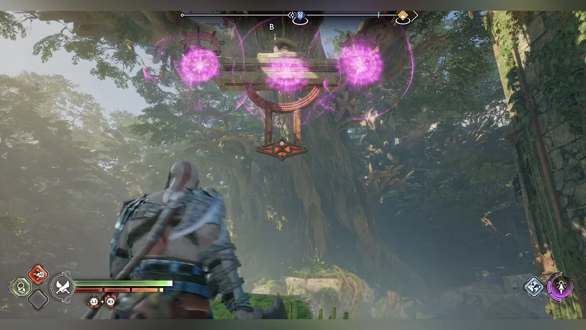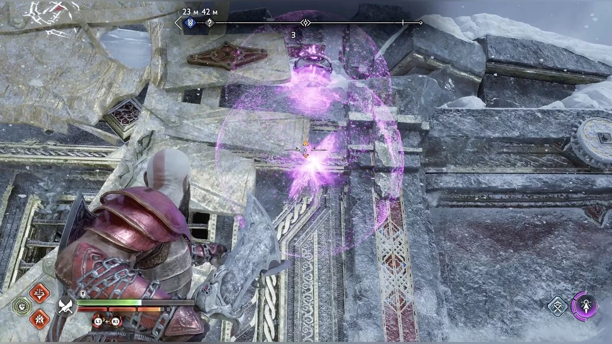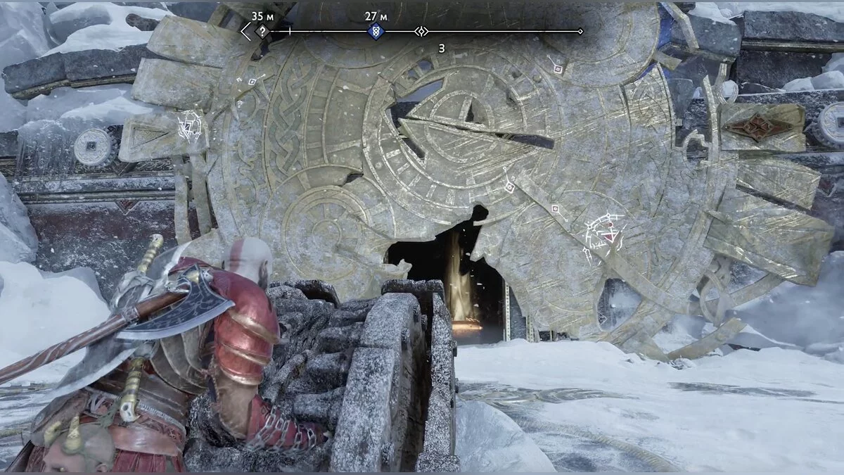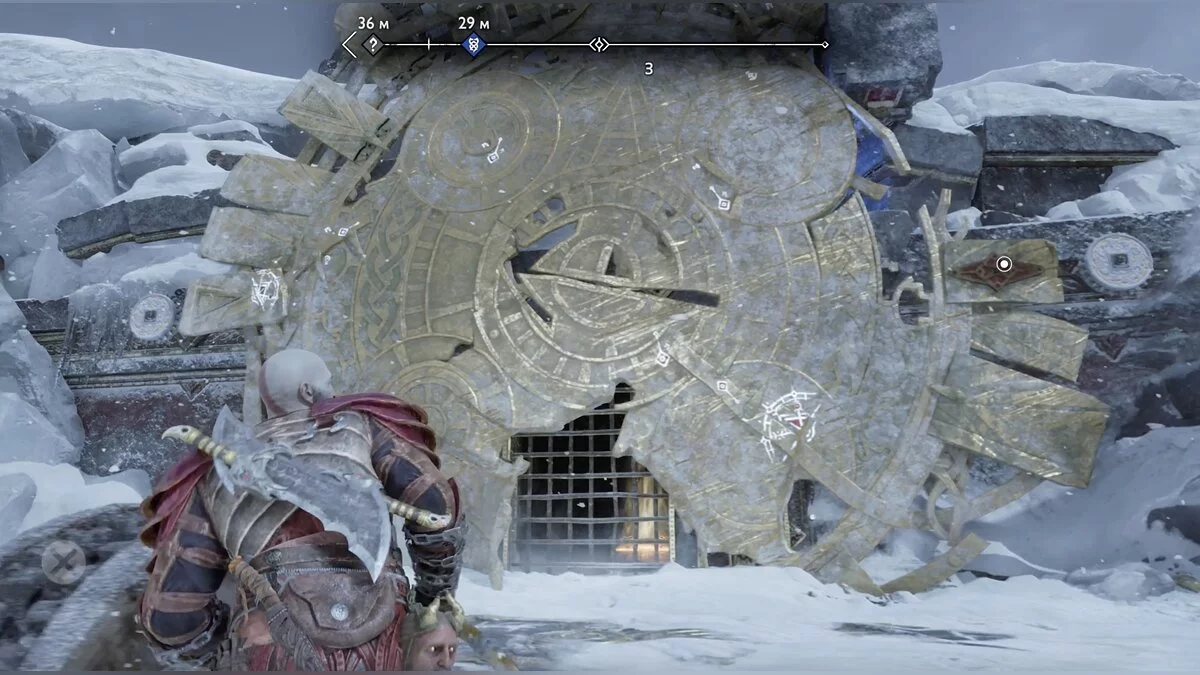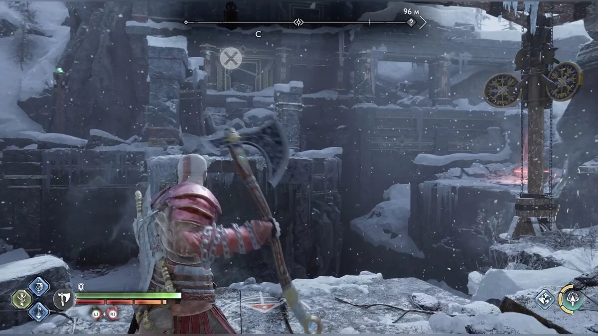 Первый будет доступен сразу. Чтобы открыть второй, выстрелите специальной стрелой в небольшой кран слева (мерцает зеленым). Третий колокол — самый сложный. Сначала нужно ударить топором по вращающемуся механизму, чтобы поднять колокол, а затем успеть быстро швырнуть топор еще раз. В противном случае колокол опустится вниз за ограждение. Рекомендуем начинать последовательность именно с этой руны, так как с двумя оставшимися вы разберетесь быстро, главное метко швырять топор.