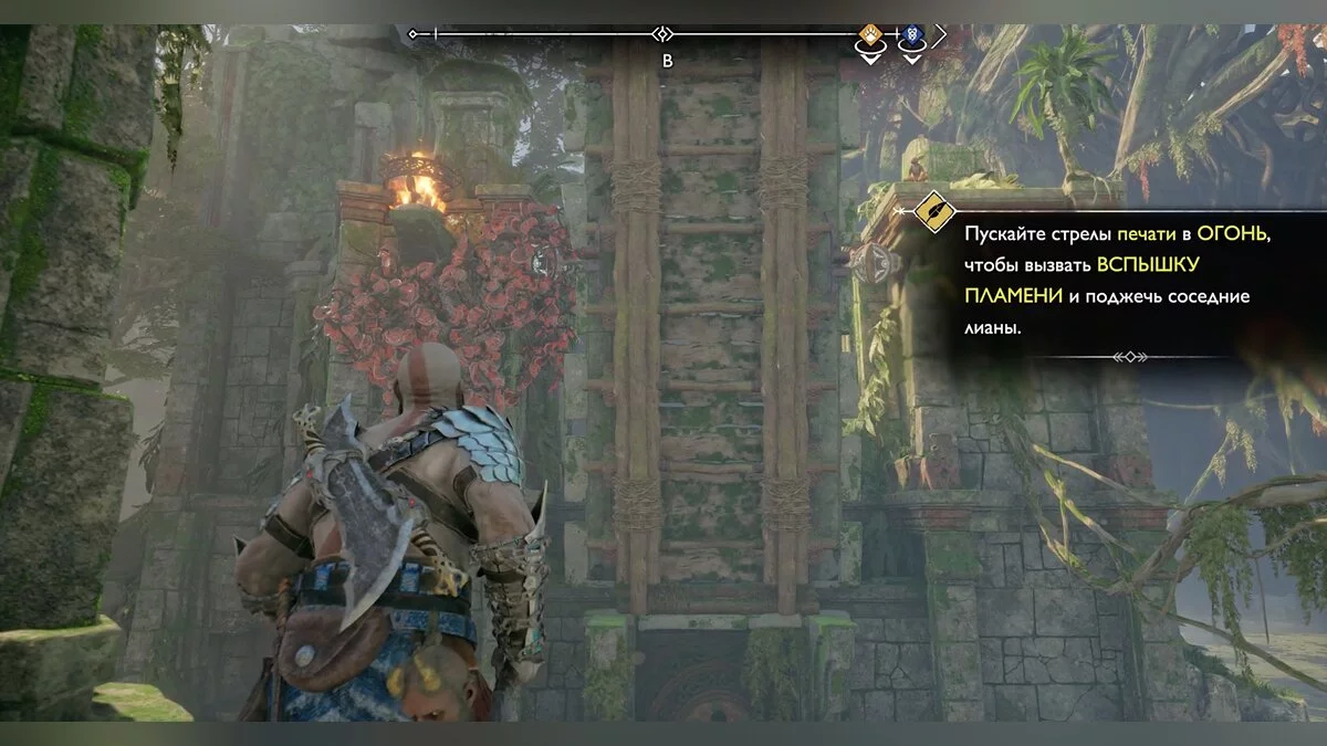 Идите вперед и убейте несколько агрессивных животных, откройте малый сундук. Забирайтесь на уступ, откройте подъемник, сжигая колючие лианы. Сразу же разбейте кристалл на стене справа.