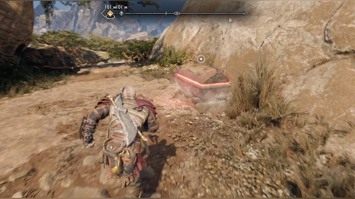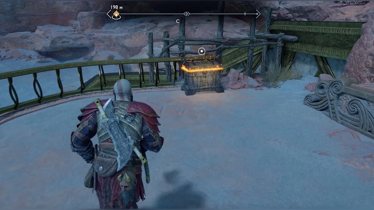 Второе место около заблокированного моста рядом с тоннелем, через который Кратос и Атрей впервые попали из порта в сам город. На другой стороне вы сможете продвинуться в квесте «Цветущие миры» и открыть малый сундук.