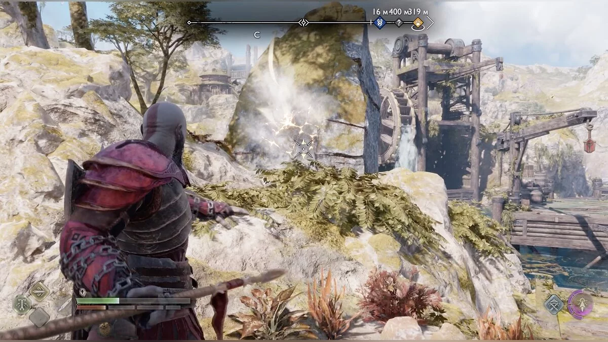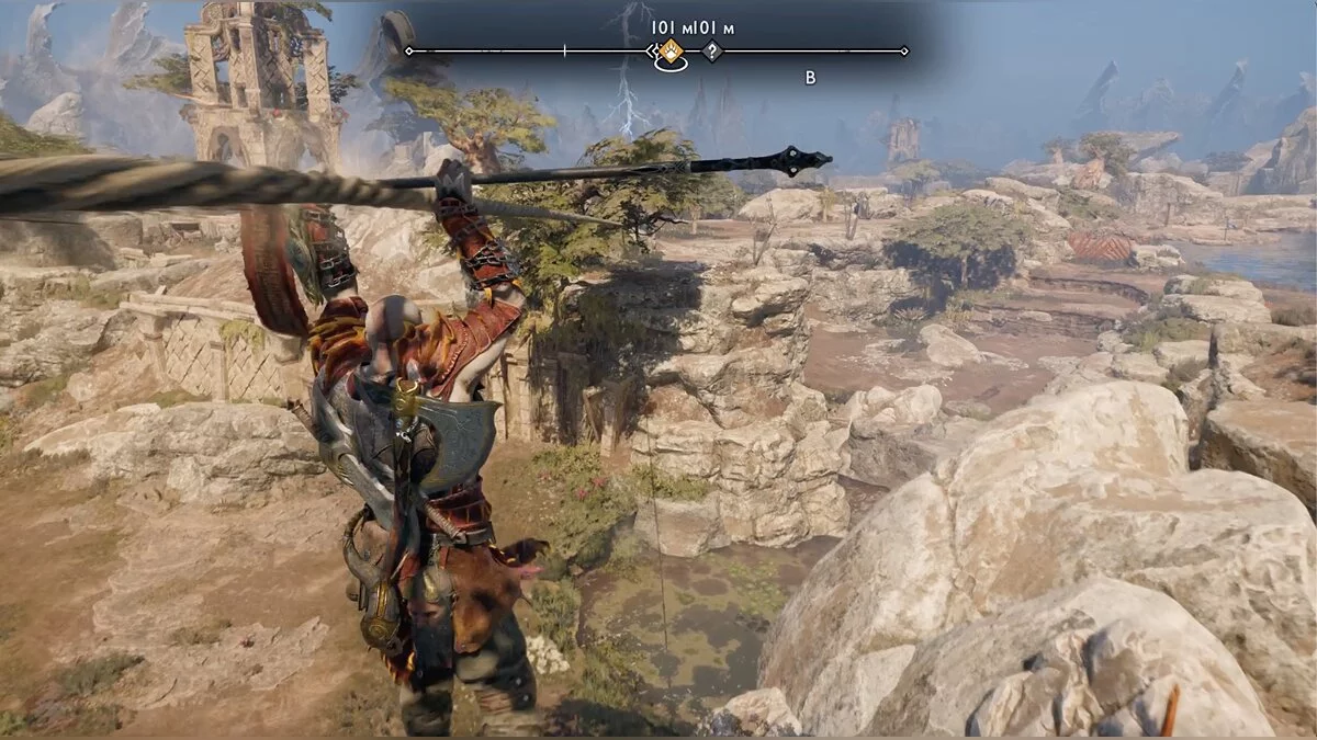 Откройте плотину, об этом мы подробно пишем в квесте «Возвращение реки». Развернитесь — можно перепрыгнуть, но не хватает перекладины. Найдите оптимальную точку и используйте копье.