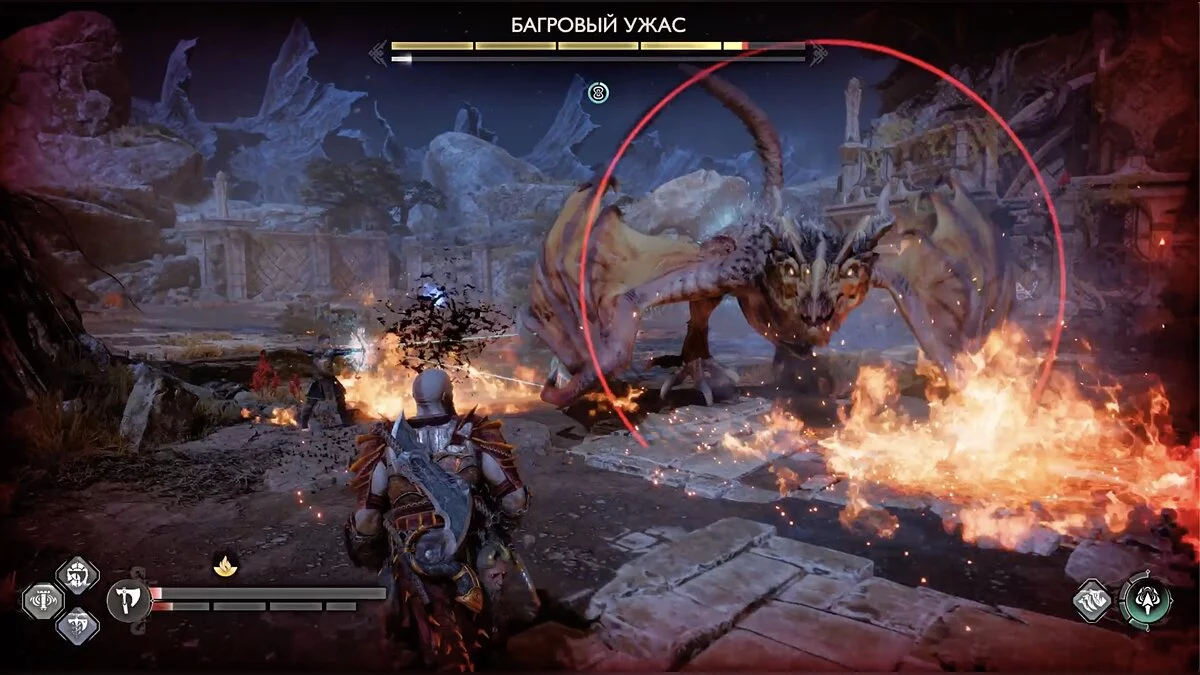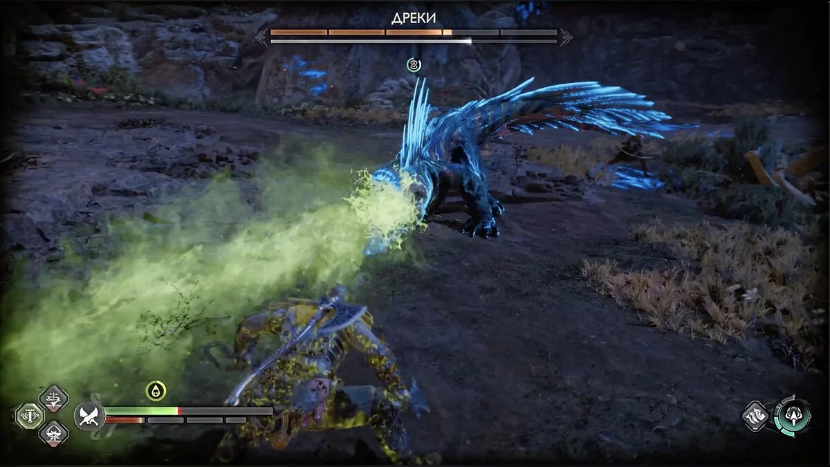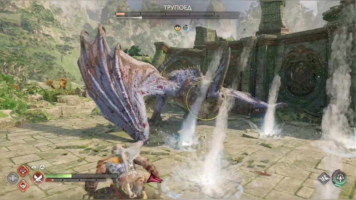 В целом все крылатые ящеры Кратера атакую примерно одинаково, меняются лишь стихии. Этот дракон ледяной, поэтому периодически будет атаковать струями льда. Также животное отпрыгивает и выстреливает в Кратоса несколькими ледяными сгустками. В остальное время Трупоед либо кусает челюстями, либо взлетает в небо и бьет льдом по площади.