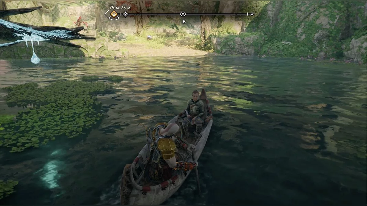 Когда выполните в Джунглях просьбу «Возвращение реки», вернитесь в локацию Колодцы. Снова попадите в просторную локацию с мистическими вратами, где нашли первого оленя. Раньше там была пропасть, теперь же река. Плывите направо. Подберите животворную росу Иггдрасиля.