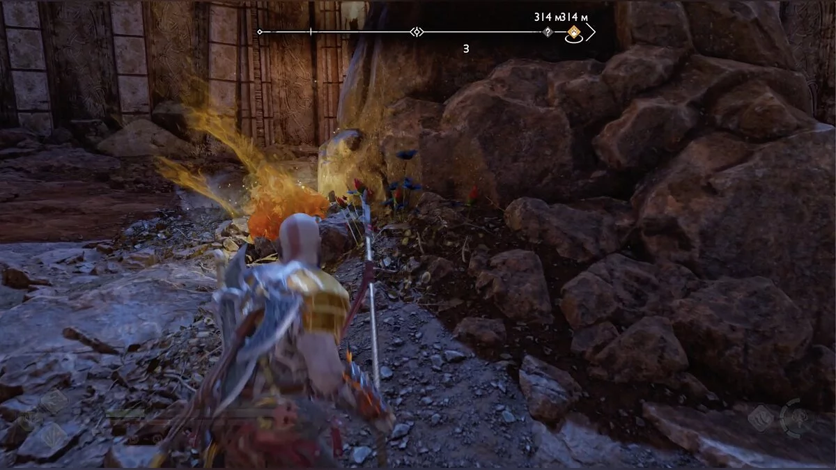 Забравшись на уступ, вы окажетесь очень близко к дракону. Его пламя не только наносит урон, но и отбрасывает вас. Постарайтесь добежать до стены слева — она вас защитит. Справа в стене уязвимость — взорвите ее и завалите окно для дракона камнями. Тут же можно завершить задание «Жертва войны: Песочные часы».