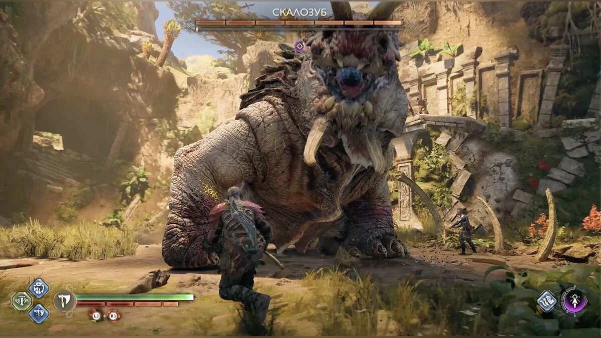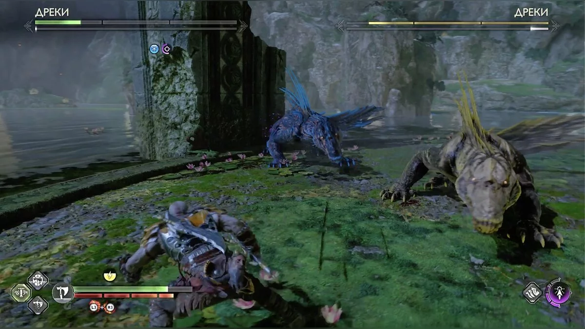Возвращайтесь на берег и спрыгните на просторную арену перед вами. Появится очередная ящерица — дреки. Она плюется ядом, что может стать проблемой. Старайтесь блокировать такие атаки или уворачиваться. В остальном это совершенно обычная дреки, которых вы убили уже целый отряд.