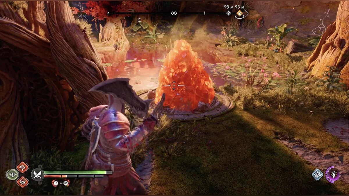 Перепрыгните с помощью клинков на другую сторону и спуститесь справа за ресурсами после ящерицы. Тут же есть плита с рунами для метки легенд.