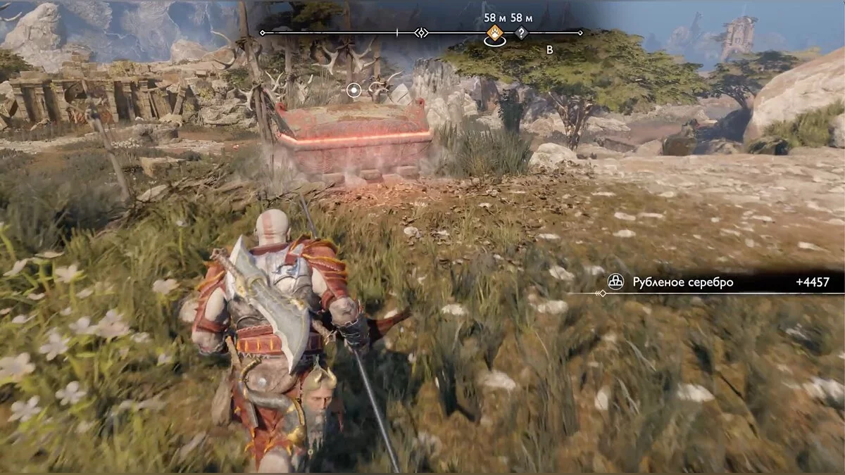 В центре руин могила берсерка и большой сундук. Если встанете лицом к круглым руинам, идите налево — цветок. Пройдите еще немного вперед — слева большой сундук.