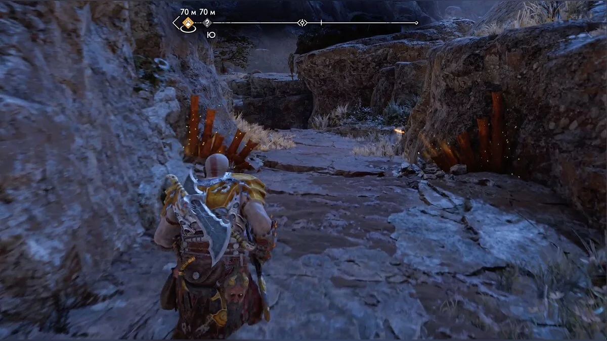 К счастью, долго искать не придется. Вернитесь немного назад и заберитесь на уступ. Вы найдете очередной алтарь времени суток и кузницу гномов. Пройдите мимо мистических врат и встаньте на обрыве. Посмотрите вниз и вправо — в скале уязвимость. Теперь спускайтесь в просторную часть локации, где выполняли квест «У всех на виду» и держитесь левой скалы — увидите еще две уязвимости. Воткните во все копья и одновременно взорвите, чтобы расчистить путь. Впереди будет свиток и большой сундук.