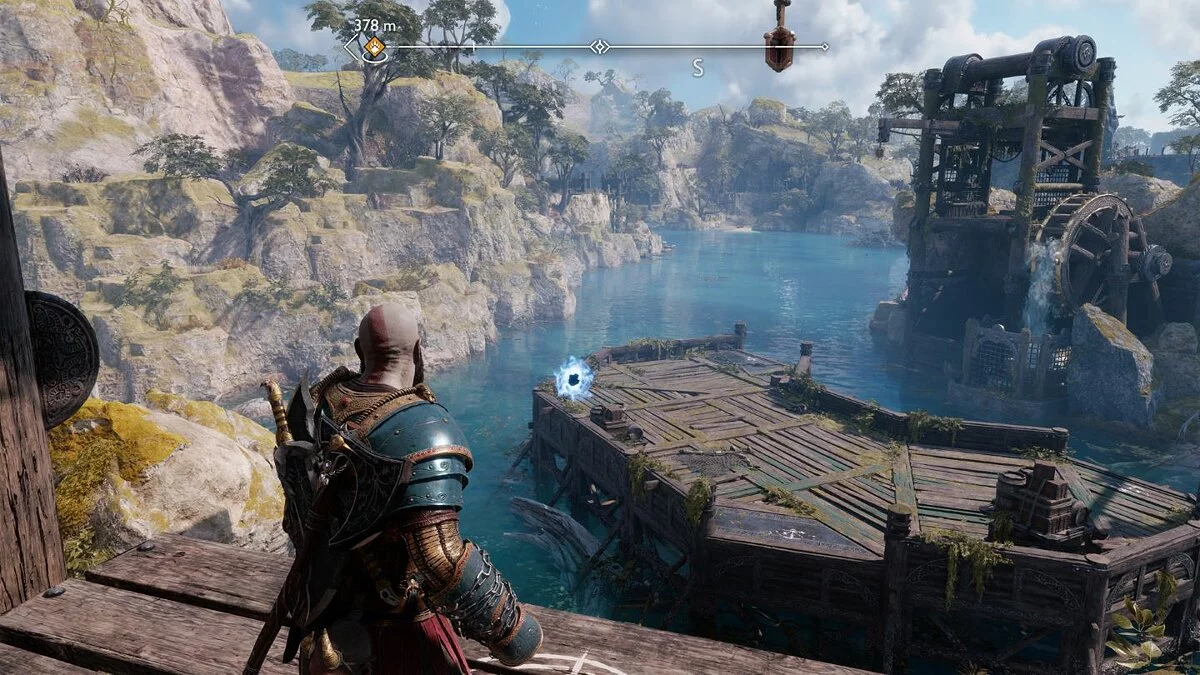 Доберитесь до острова Альберих и заберитесь на скалу рядом с водяной мельницей. Разбейте камень копьём, перепрыгните на деревянную платформу, а с неё на противоположный берег. Далее заберитесь на островок и подберите свиток.