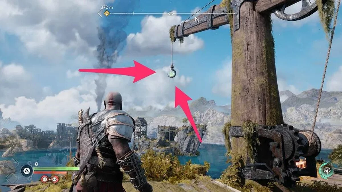 Попасть в область с этим вороном вы сможете только после того, как приобретете оружие в Кузнице в Свартальвхейме с Броком в рамках сюжетной истории. Используйте его слева от сундука на острове, чтобы подняться наверх.