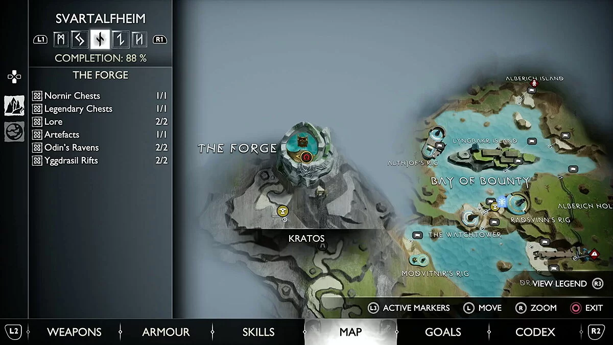 Следуйте через Храм Света, пока не доберетесь до Света Альвхейма. Когда вы сделаете это, поверните направо на большую винтовую лестницу. Пройдите по ней всего несколько шагов, а затем спрыгните с левой стороны. Вы окажетесь в небольшой области с Артефактом, легендарным сундуком и одним из воронов Одина.