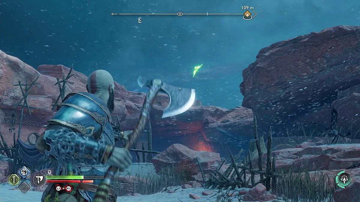 Цельтесь в нижнюю левую часть кристалла и встаньте Кратосом так, чтобы линия стала синей. Как только вы окажетесь на позиции, бросьте свой топор.
