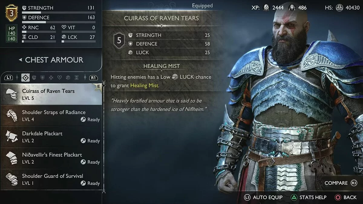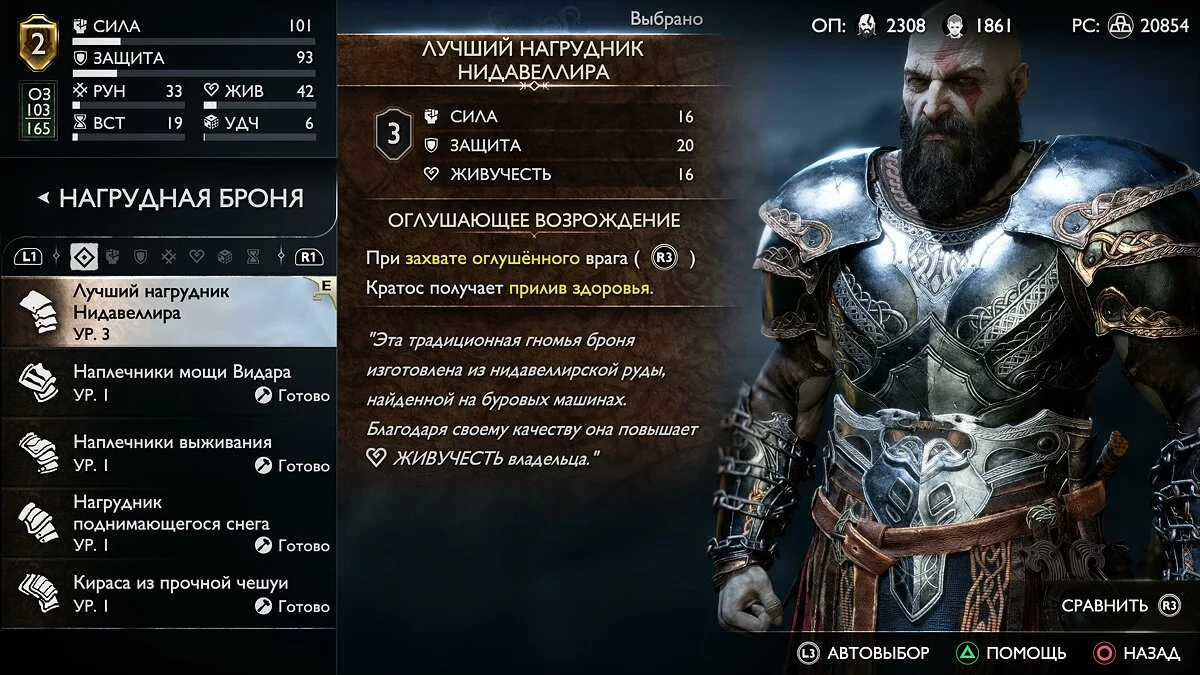 В начале игры мы рекомендуем обратить внимание на броню Нидавеллира, а именно на «Лучший нагрудник Нидавеллира». С помощью этого артефакта игрок сможет восполнять небольшое количество здоровья после активации эффектных добиваний противников. Прирост незначительный, но способный спасти Кратоса от неминуемой гибели.
