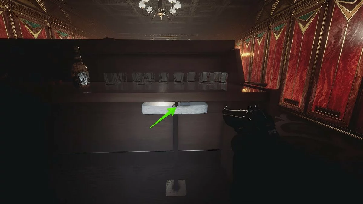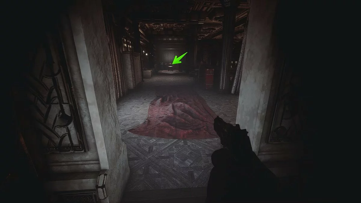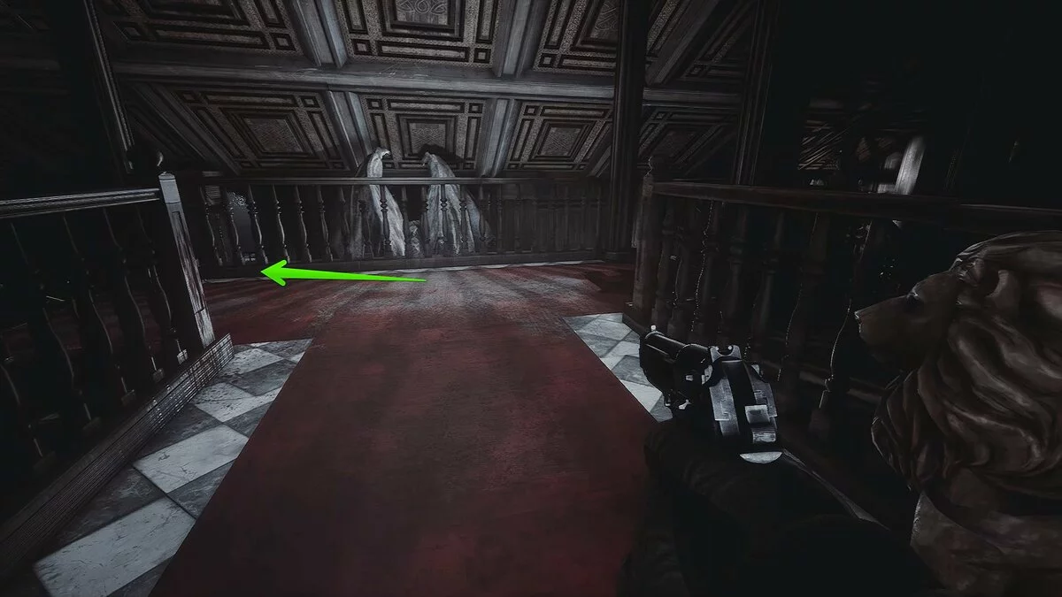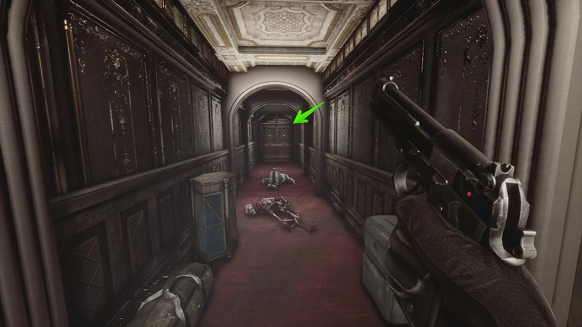 Покиньте это крыло и вернитесь в центральный зал. Следуйте на этаж выше, войдите в двойные двери. Справа есть пули для дробовика, в следующем коридоре слева стоит мёртвый крупье. Пройдите вперёд и убейте ещё одного упыря. Слева от лестницы игровая комната. Под барной стойкой лежат патроны.