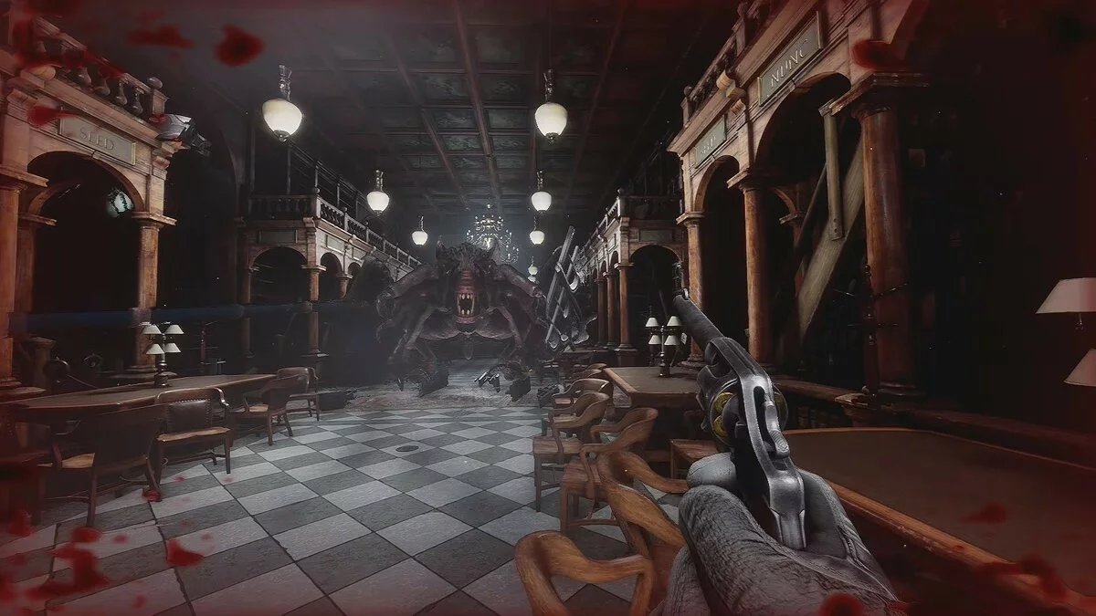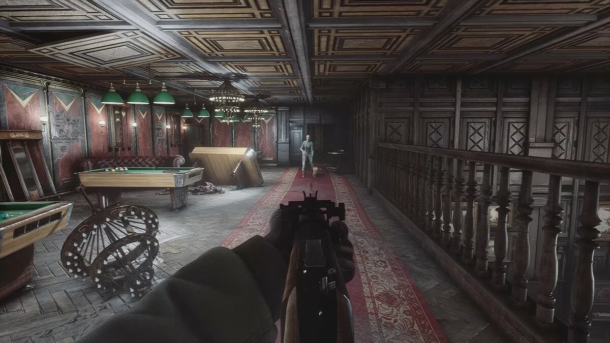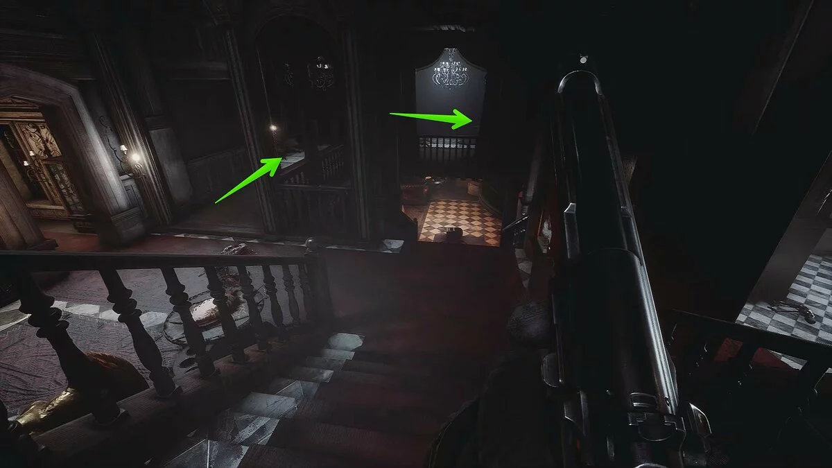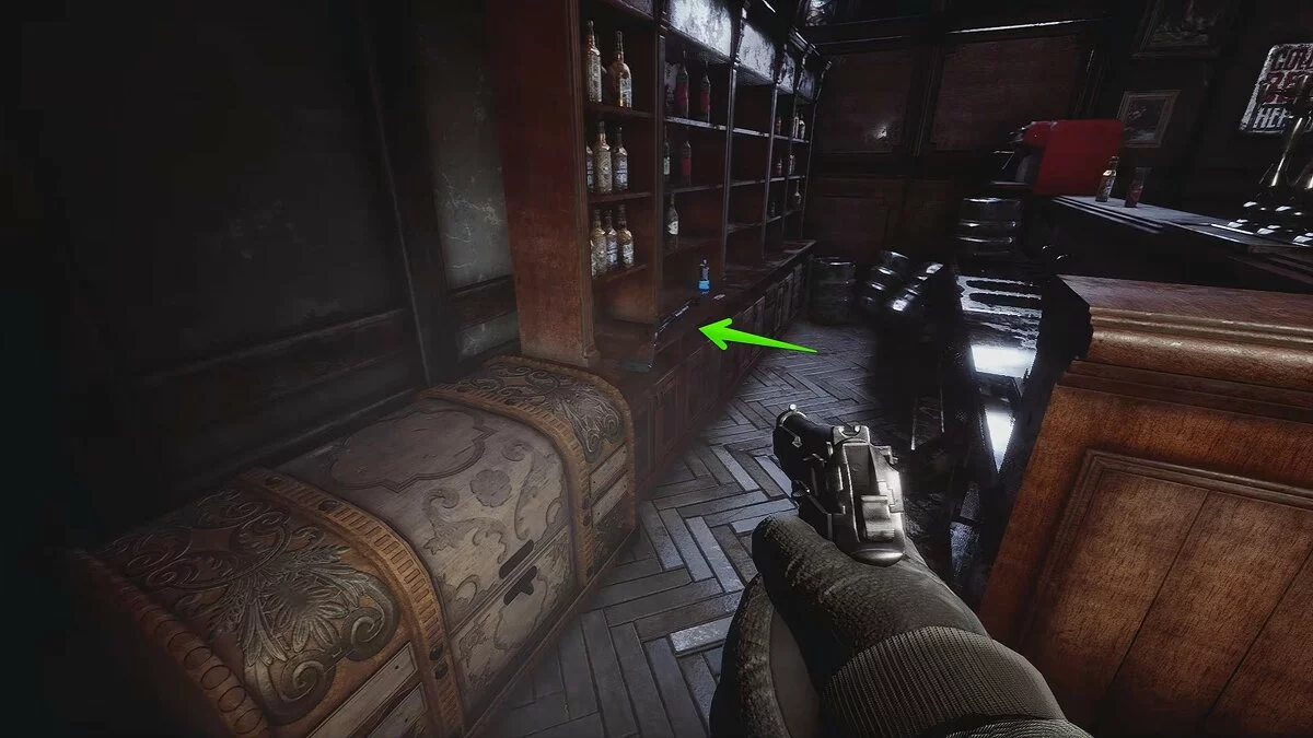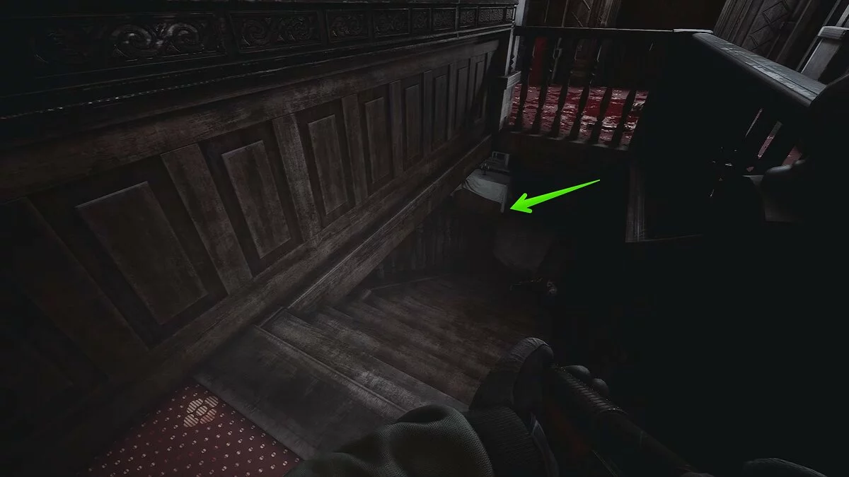 Покиньте это крыло и вернитесь в центральный зал. Следуйте на этаж выше, войдите в двойные двери. Справа есть пули для дробовика, в следующем коридоре слева стоит мёртвый крупье. Пройдите вперёд и убейте ещё одного упыря. Слева от лестницы игровая комната. Под барной стойкой лежат патроны.