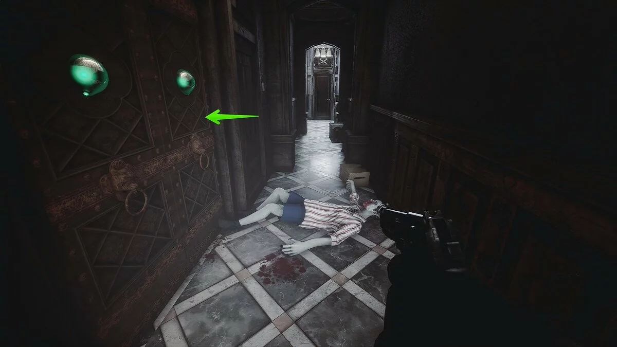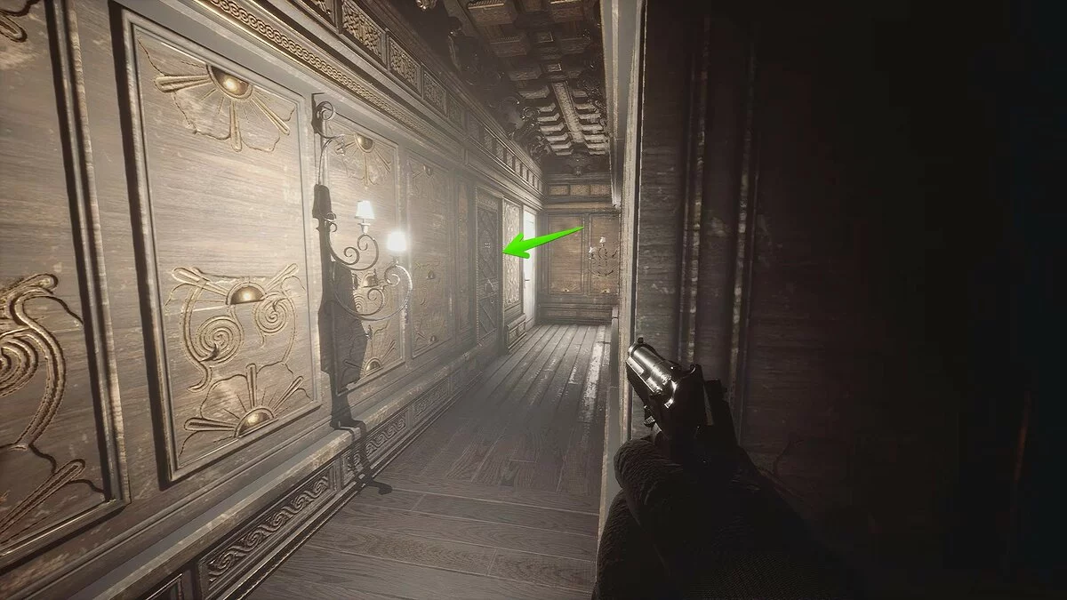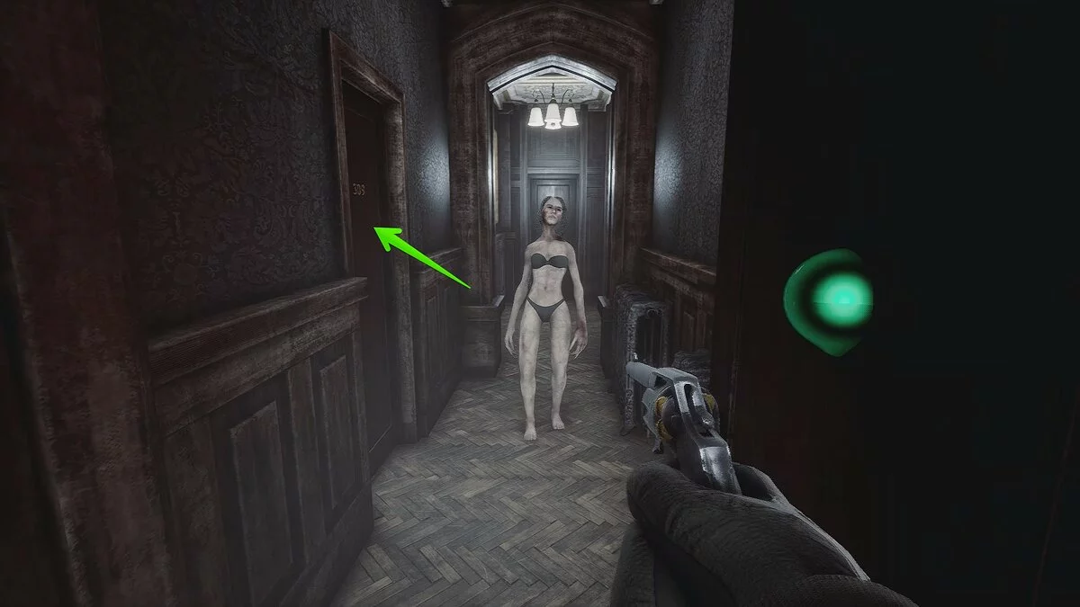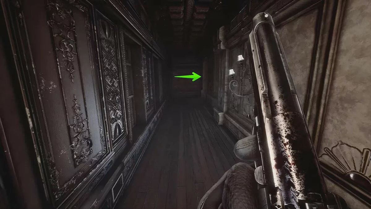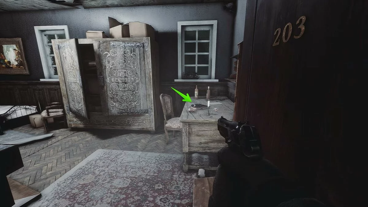Поднимитесь по лестнице наверх. Откройте дверь зелёным ключом, убейте упыря и осмотрите дверь слева (номер 309). После кат-сцены сможете забрать патроны для револьвера на полу. В этом же помещении есть пули для дробовика и дневник с расшифровкой шахмат.
