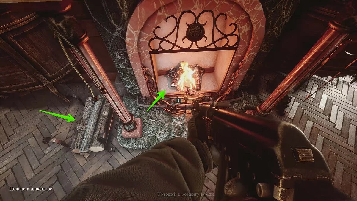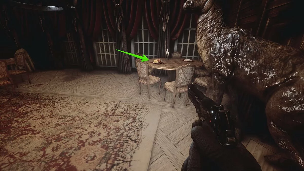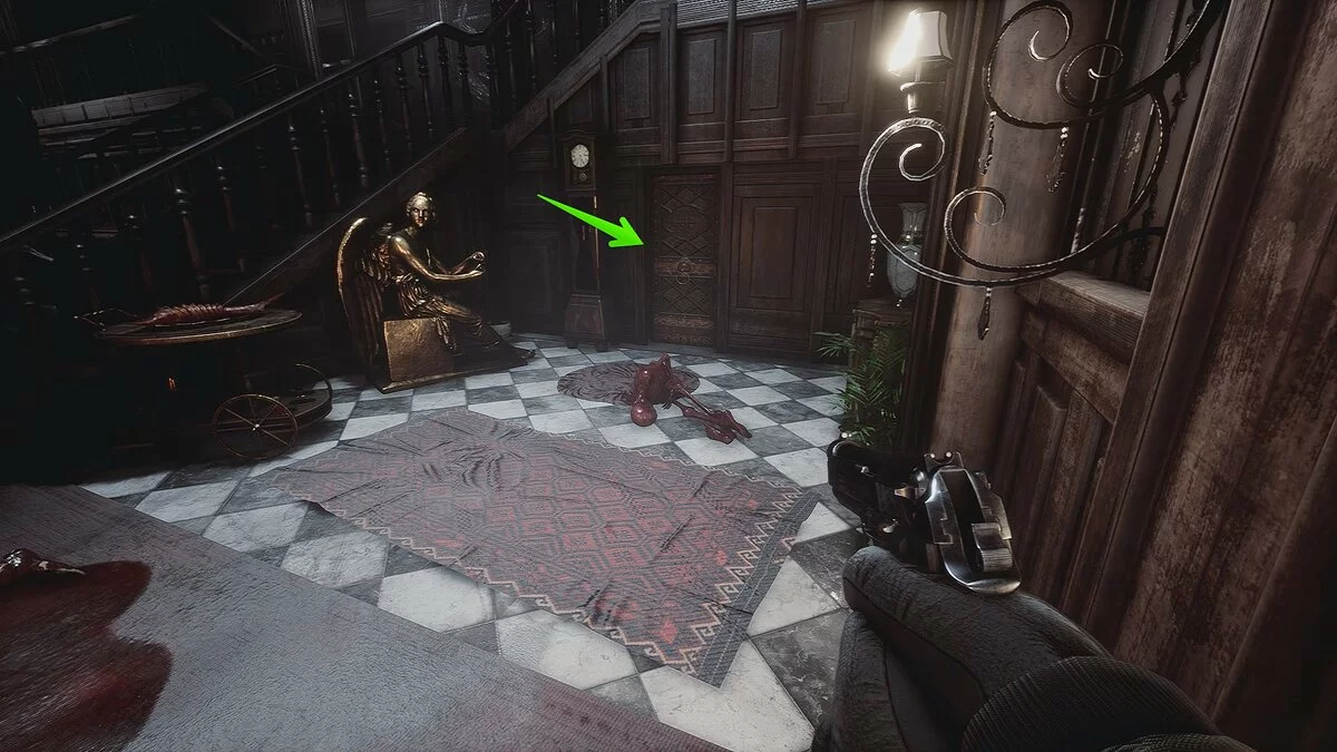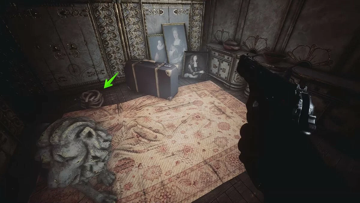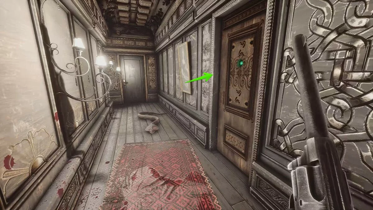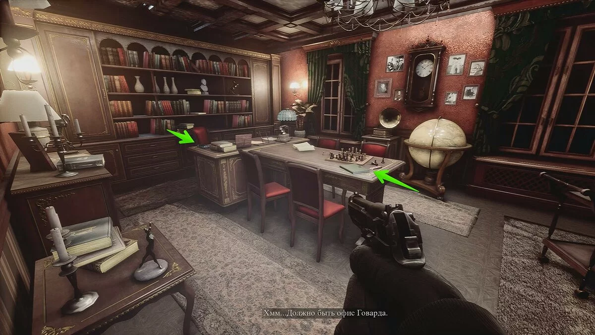 Поднимитесь по лестнице наверх. Откройте дверь зелёным ключом, убейте упыря и осмотрите дверь слева (номер 309). После кат-сцены сможете забрать патроны для револьвера на полу. В этом же помещении есть пули для дробовика и дневник с расшифровкой шахмат.
