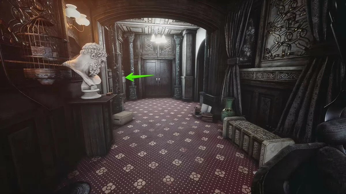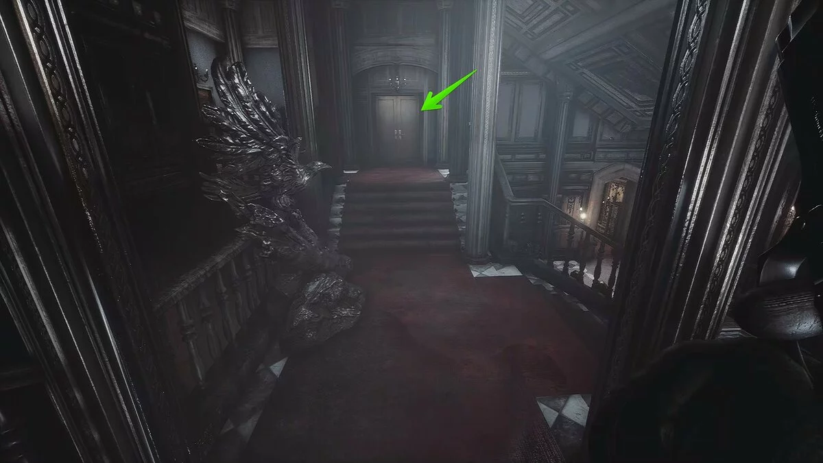 Вернитесь в холл и на третьем этаже найдите проход с двойной дверью.