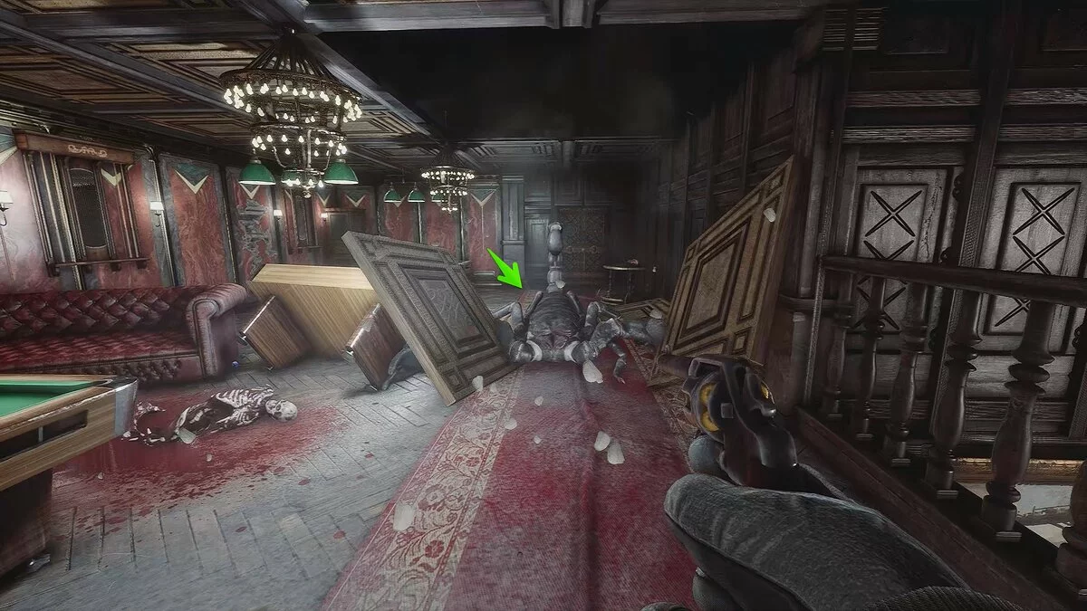 Вернитесь назад и бегите налево. Вам нужно попасть в коридор с другими номерами. В проходной комнате с бильярдными столами на вас нападёт монстр.