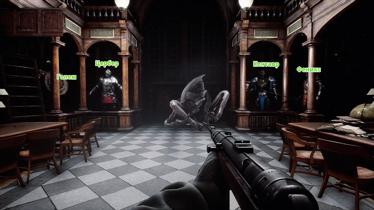 Отправляйтесь в библиотеку на втором этаже и подготовьтесь к сражению. Монстр в галерее не слишком опасный — он не перемещается по комнате, а лишь стреляет в героя жидкостью. Достаточно вовремя уворачиваться от неё.