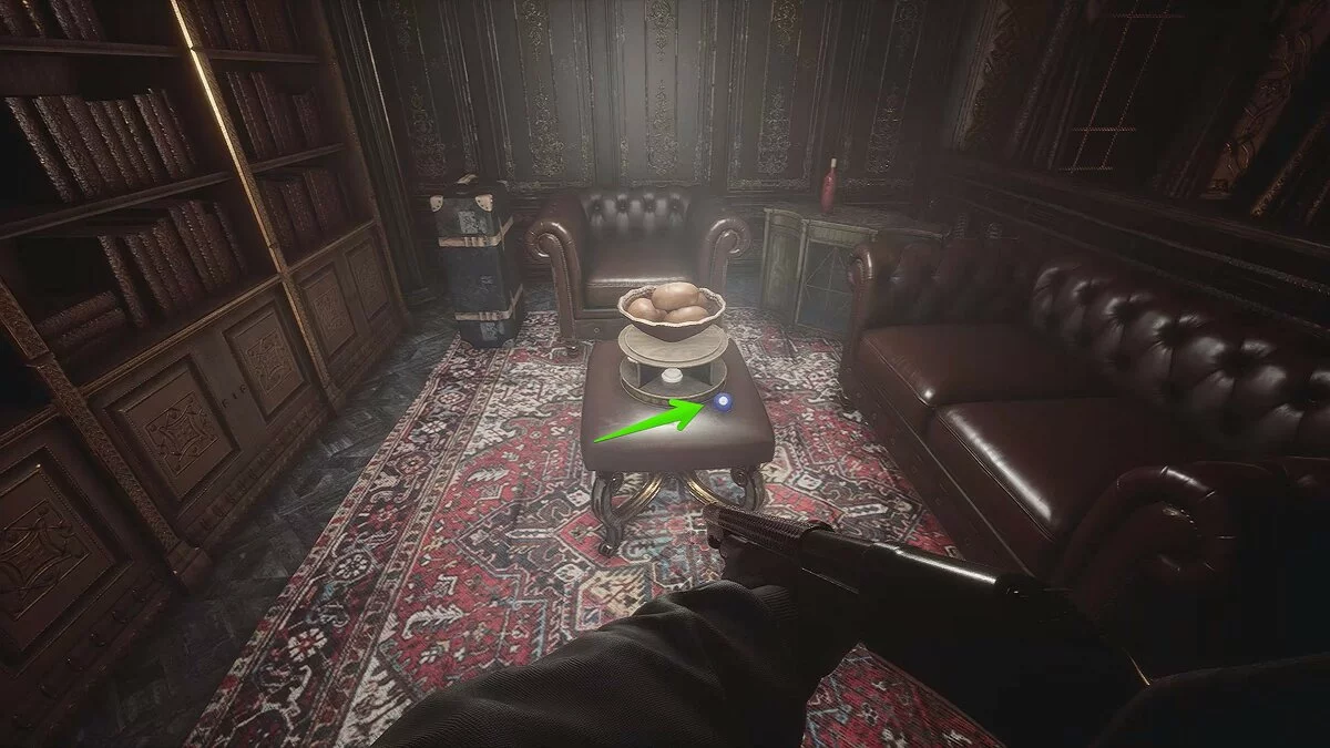 Осталось отыскать синий шар для бильярда. Вернитесь в холл и пройдите по левой стороне на второй этаж. В этом же помещении есть большой монстр, но сейчас можете игнорировать его. Пройдите вперёд и заберите синий шар.