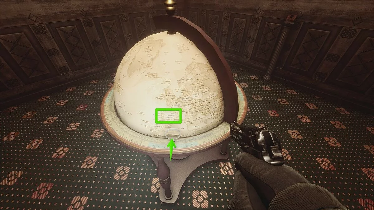 После кат-сцены покиньте кабинет и войдите в двойную дверь справа. Затем поверните налево в проход, где стоял мёртвый крупье. В конце коридора есть комната с глобусом. На глобусе отмечены месяца — ноябрь и август. Ориентируйтесь по ним.