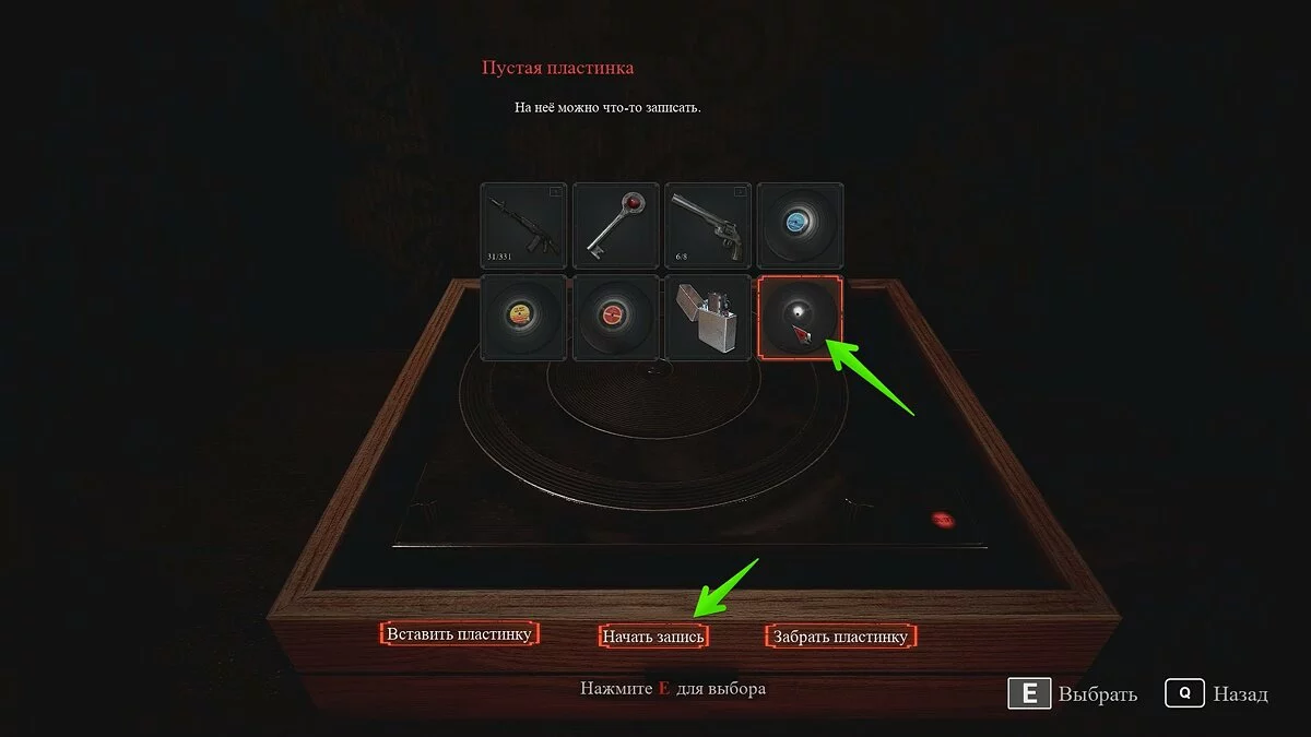 На столике в переговорной подберите зажигалку и пустую пластинку. Вставьте её в проигрыватель справа от двери. Нажмите «Начать запись».