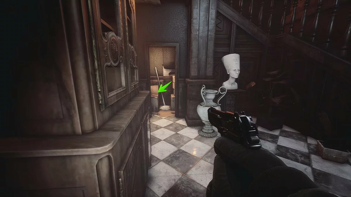 Рядом с лестницей есть сейврум с припасами. Вниз пока можно не спускаться — все двери в этом крыле заперты. Вернитесь назад к двойным дверям, напротив прохода, где стоял мёртвый крупье, и посмотрите налево. В кладовке лежит дневник.