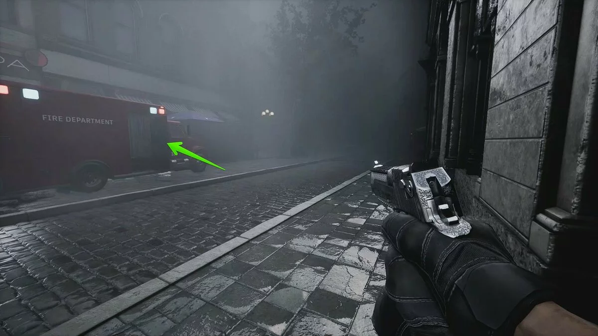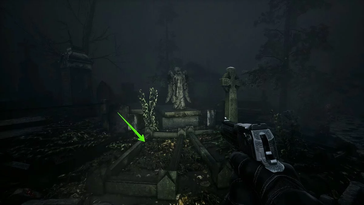 Покинув отель, бегите направо. Этот путь приведёт прямо к кладбищу. В центре кладбища найдите часовню и прочтите подсказку: «Взгляд ангела охраняет тайну». Здесь же можно найти патроны и сохранить прогресс.