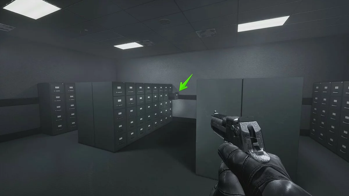 Покиньте комнату и вернитесь немного назад. Справа есть дверь в архив. По сюжету необходимо открыть только один ящик и найти досье, но в других могут находиться деньги. Правильный шкафчик указан на скриншоте ниже.