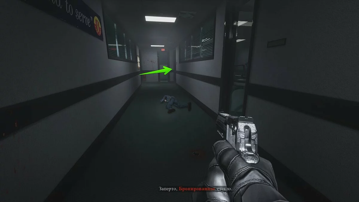Вернитесь в первый офис, где вы подобрали ключ-карту от оружейной. В этот момент зомби разобьёт стекло и нападёт на вас. Убейте его, подойдите к стеклу и переберитесь в соседнее помещение.