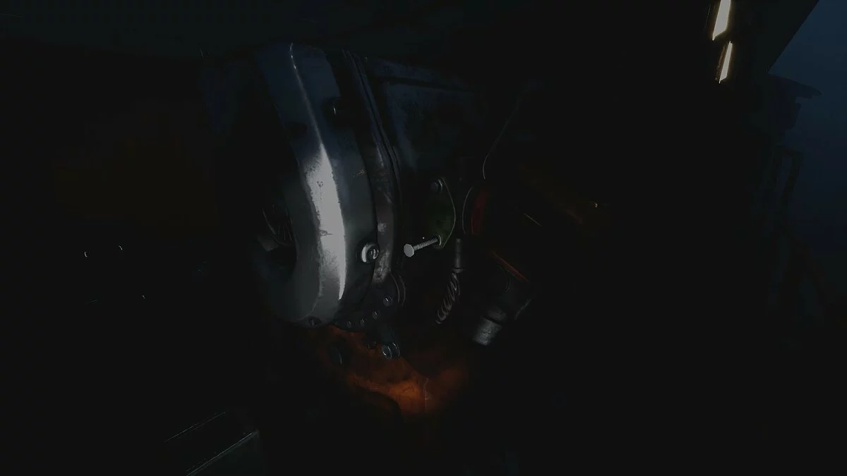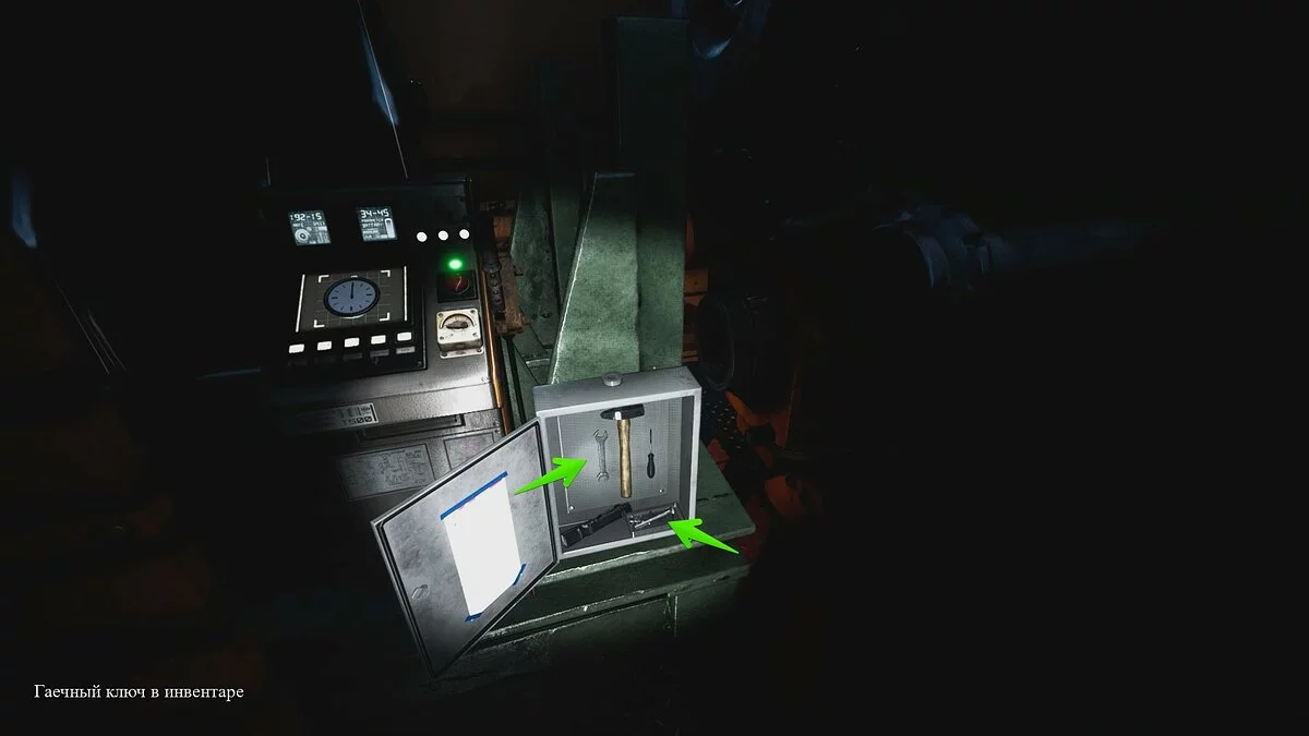 Поднимитесь на крышу и примените бензопилу на поваленное дерево. После этого спуститесь вниз. По дороге к кабине машиниста откройте топливный отсек. Осмотрите шкафчик под рычагом, заберите гаечный ключ и болт.